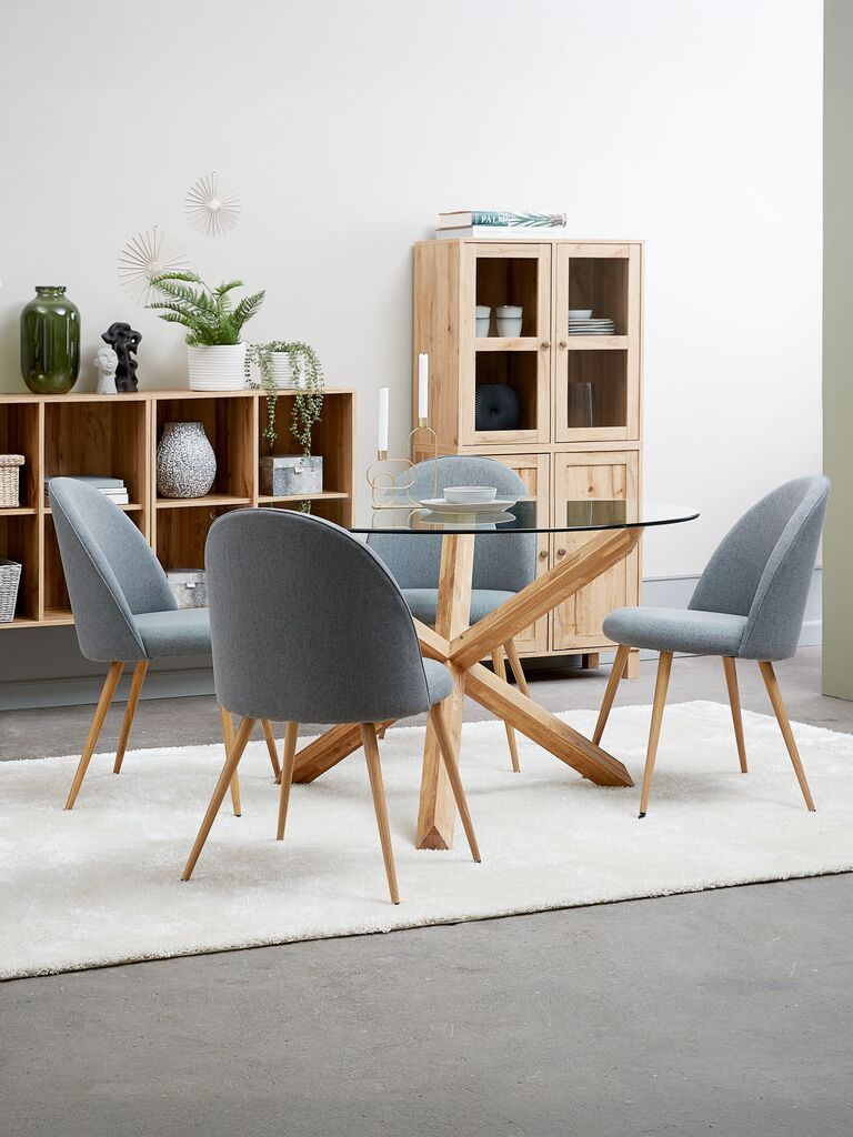 Masă: Lemn masiv de stejar și sticlă securizată. Ø119x75 cm Scaun: Material textil și oțel