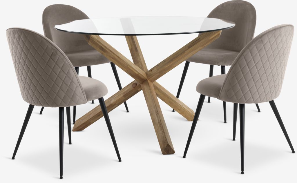 Masă cu blat din sticlă securizată și picioare din lemn masiv de stejar. Lemnul este tratat cu ulei pentru protejarea și conservarea culorii naturale. 90x160x75 cm