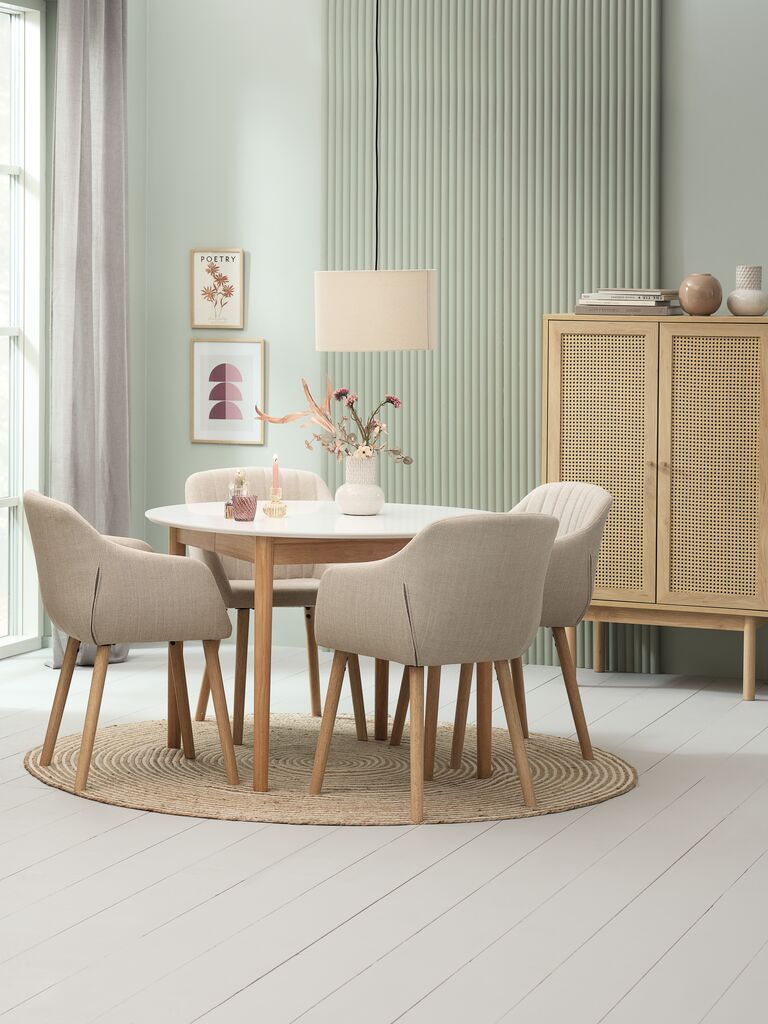 Masă extensibilă cu 2 extensii. Blat alb din MDF și picioare din lemn masiv. Lemnul este lăcuit. Se poate extinde până la 200 cm pentru reuniuni mari. Ø110x75cm