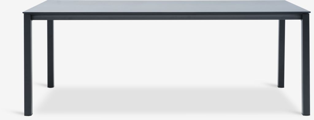Masă de grădină neagră cu blat din lemn compozit DURAWOOD® și cadru și picioare din aluminiu vopsit cu pulbere. DURAWOOD® este un material compozit durabil format din fibre de lemn de esență tare FSC® și plastic. Are aspectul și textura lemnului natural fără a necesita întreținere. Aluminiul este un material ușor și robust, care nu ruginește. 95x207x75 cm