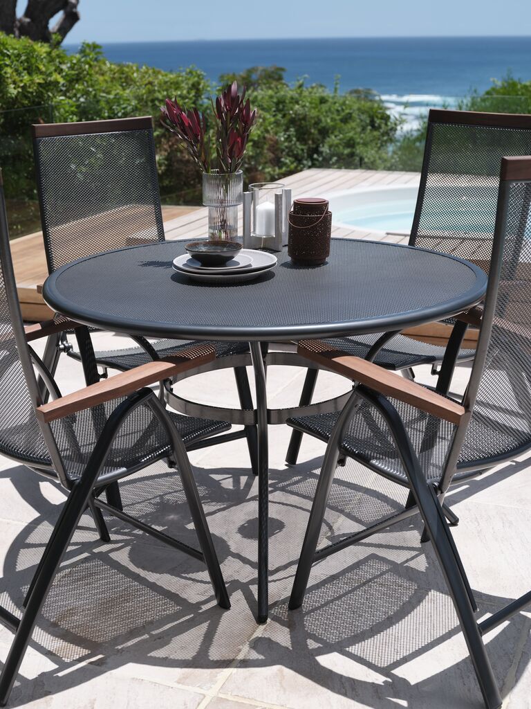 Masă rotundă de grădină cu blat gri din oțel. Cadru din aluminiu și picioare din oțel. Aluminiul este un material ușor și robust, care nu ruginește. Oțelul este tratat cu un strat Durasint® care previne ruginirea. Ø120x74 cm