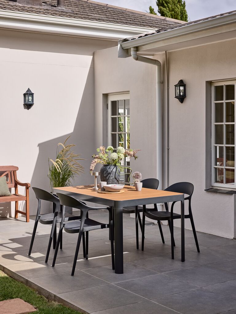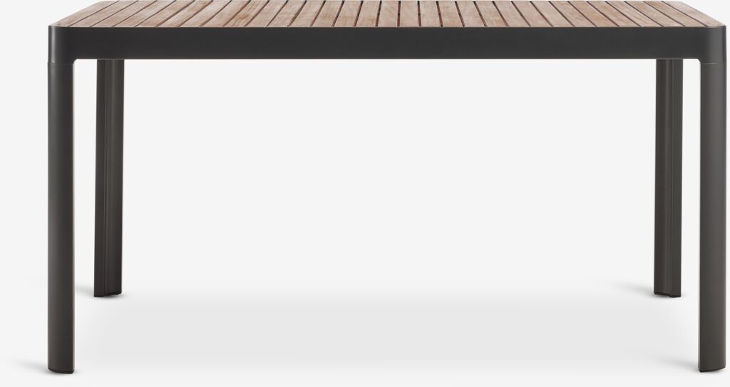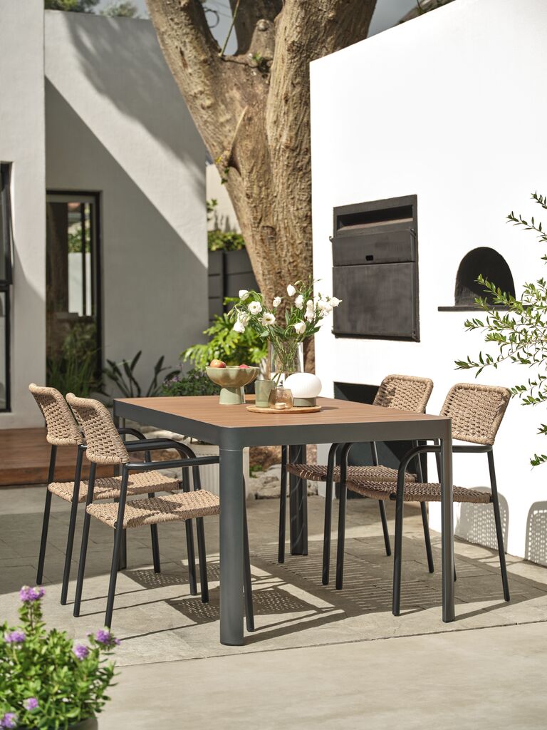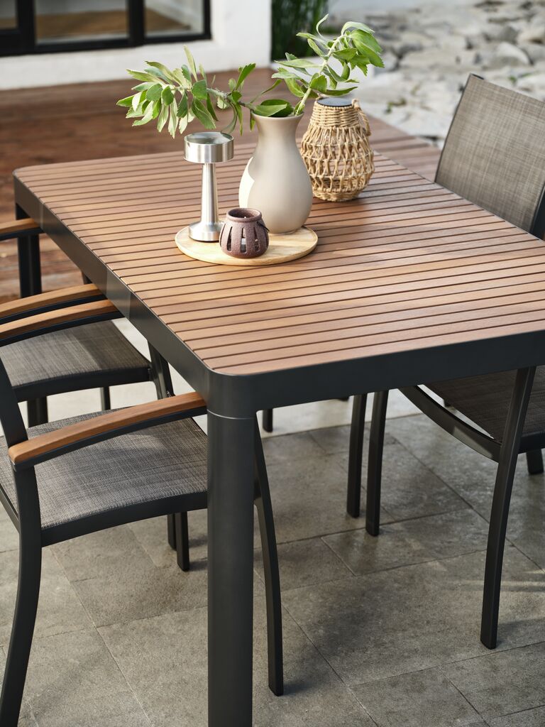 Masă de grădină cu blat din lemn de esență tare FSC®, tratat cu ulei. Cadru și picioare gri închis din aluminiu vopsit. Lemnul durabil este tratat cu ulei pentru a-l proteja și a-i evidenția culoarea naturală. Se recomandă ungerea regulată a lemnului pentru a-i menține culoarea și a-l proteja de umiditate. Aluminiul este un material ușor și robust, care nu ruginește. 91x149x75 cm