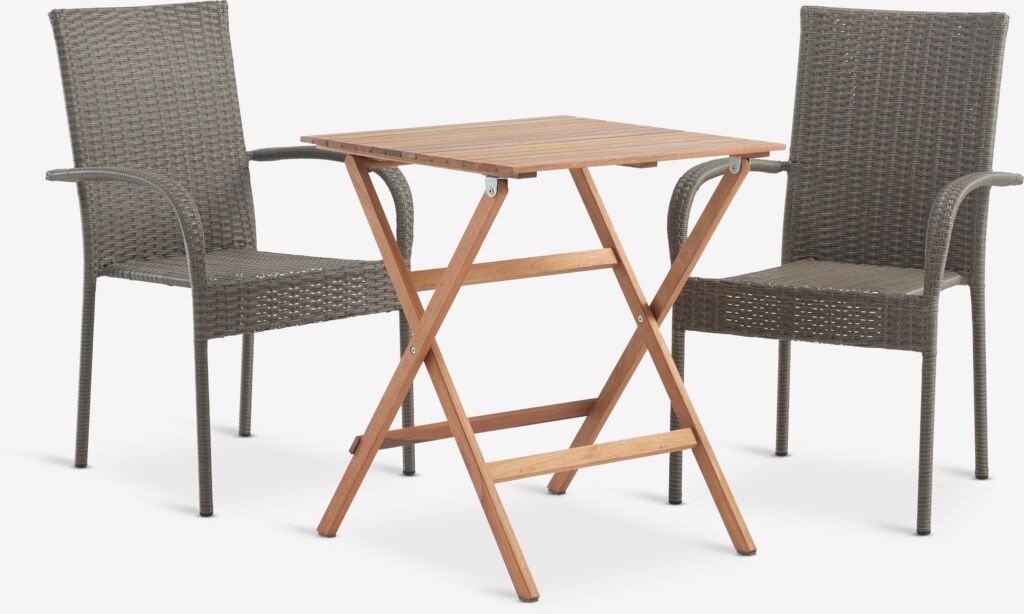 Set de terasă cu 2 locuri. Masă: Lemn de esență tare FSC®, tratat cu ulei. Pliabilă. 62x62x74 cm Scaun: Oțel și poliratan. Stivuibil.