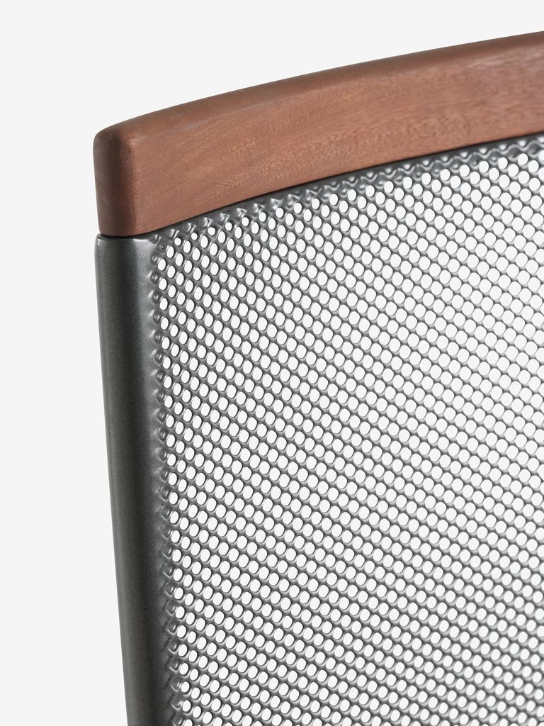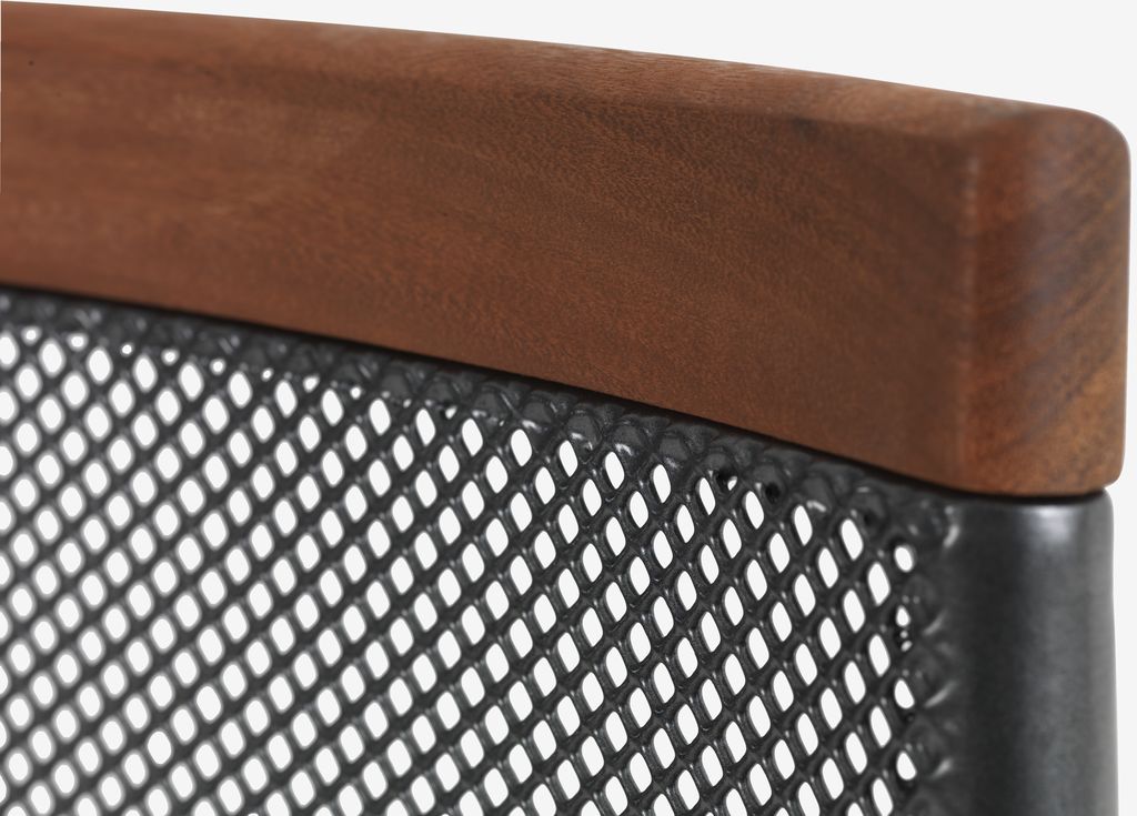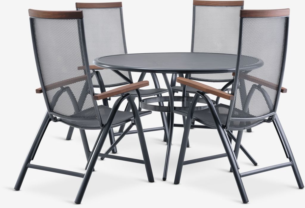 Set de grădină cu 4 locuri. Masă: Aluminiu și oțel. Cu tratament împotriva ruginii Durasint®. Ø120x74 cm Scaun: Aluminiu și lemn de esență tare FSC®, tratat cu ulei. Cu tratament împotriva ruginii Durasint®. Stivuibil.