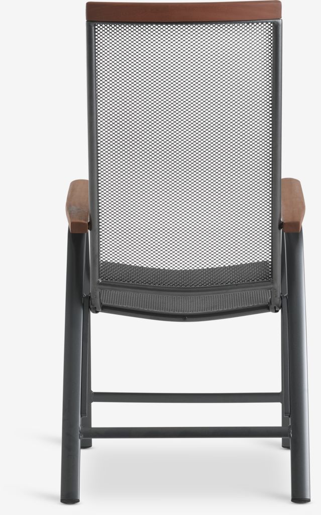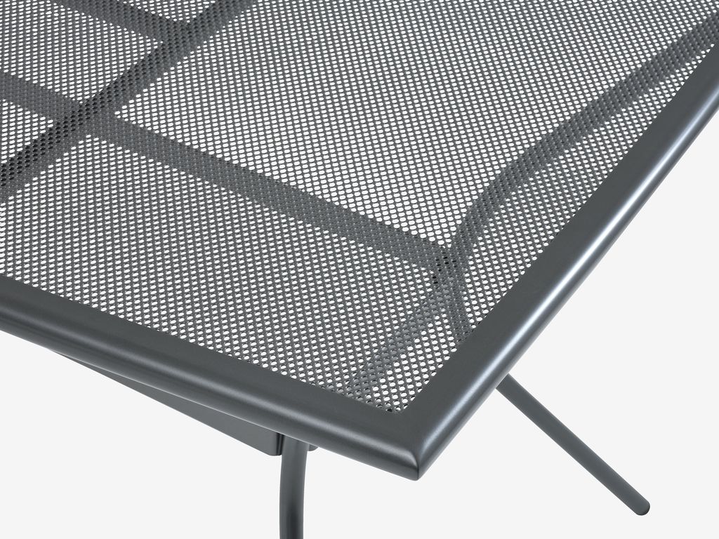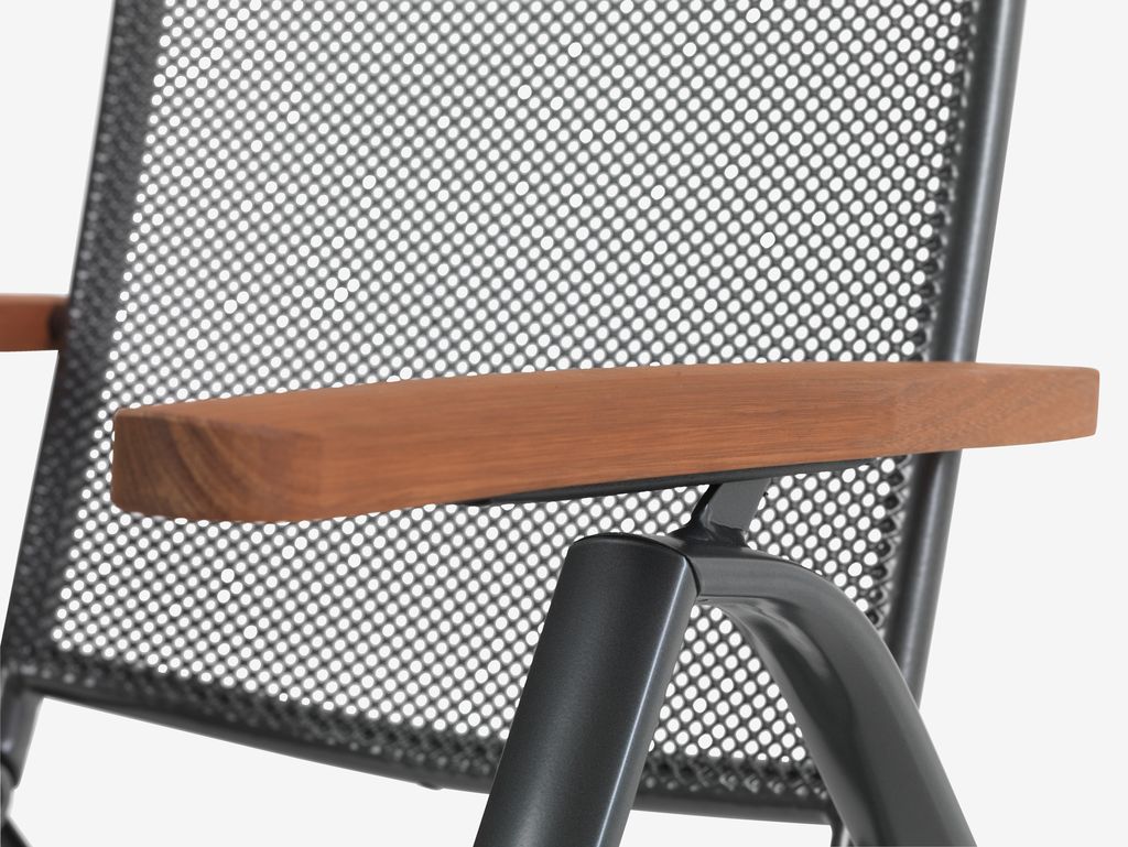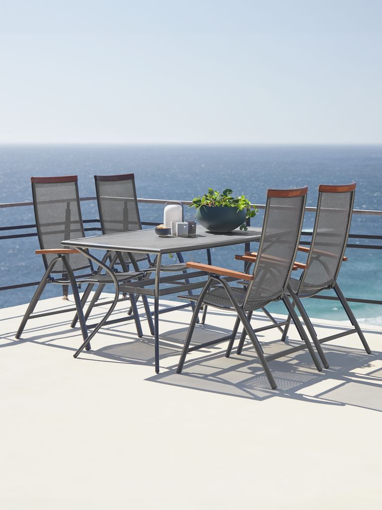 Set de grădină cu 4 locuri. Masă: Aluminiu și oțel. Cu tratament împotriva ruginii Durasint®. 90x150x74 cm Scaun: Aluminiu, oțel și lemn de esență tare FSC®, tratat cu ulei. Cu tratament împotriva ruginii Durasint®. 5 poziții. Pliabil.
