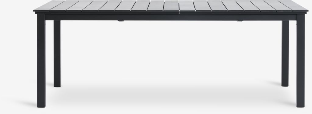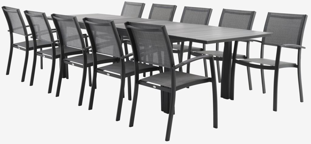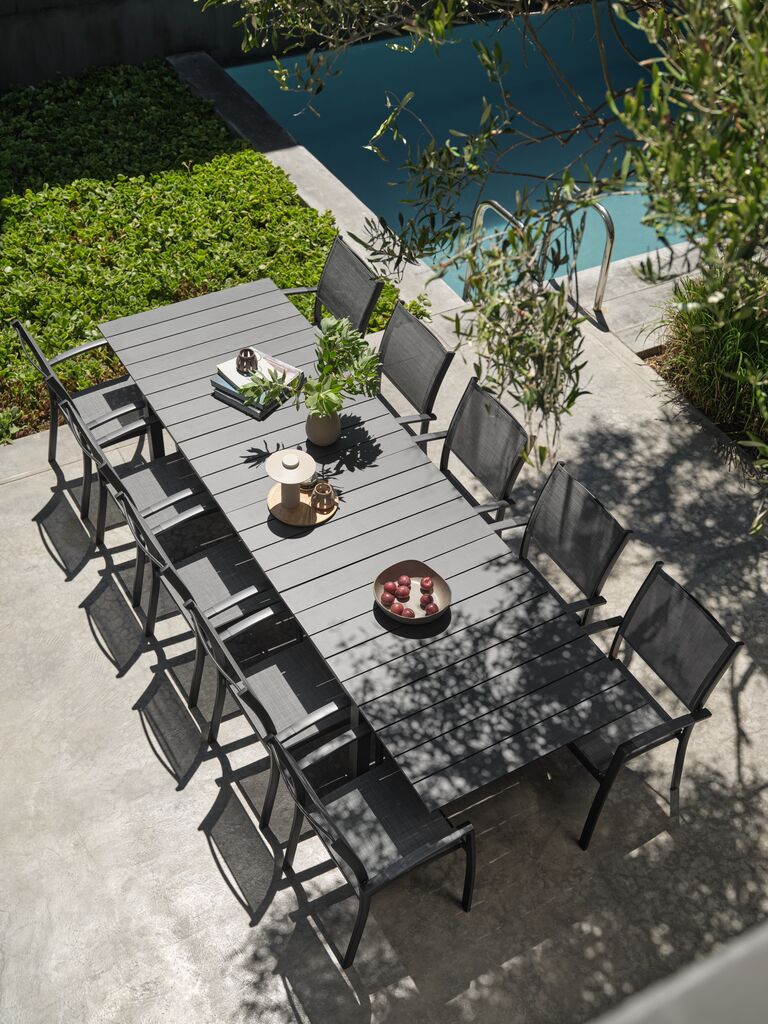 Masă: Aluminiu și DURAWOOD® Lemn compozit. Incl. 2 extensii care pot fi depozitate sub blat. 95x214/265/315x77 cm Scaun: Aluminiu și textilină. Stivuibil.