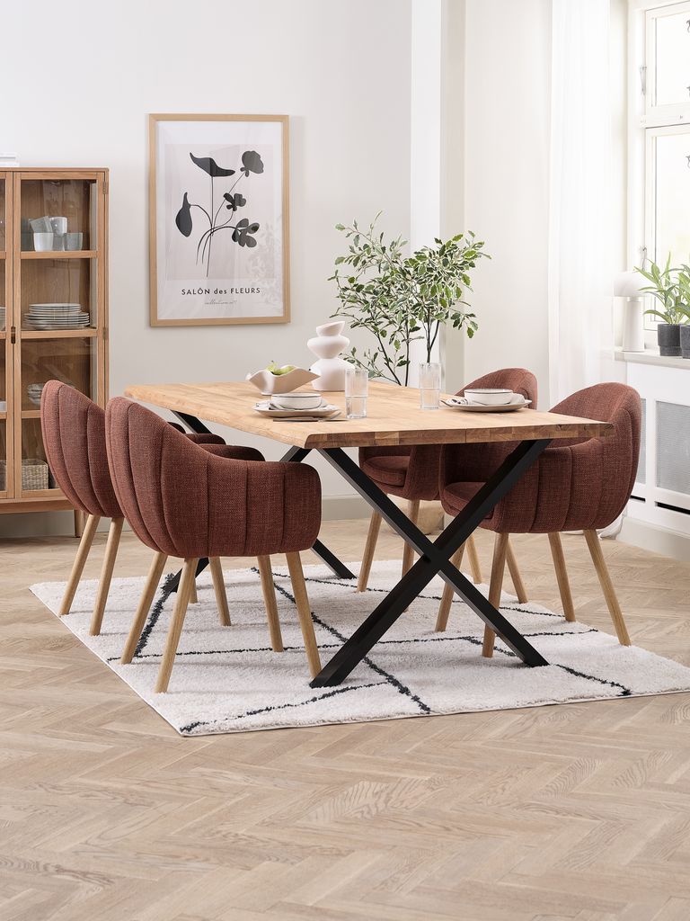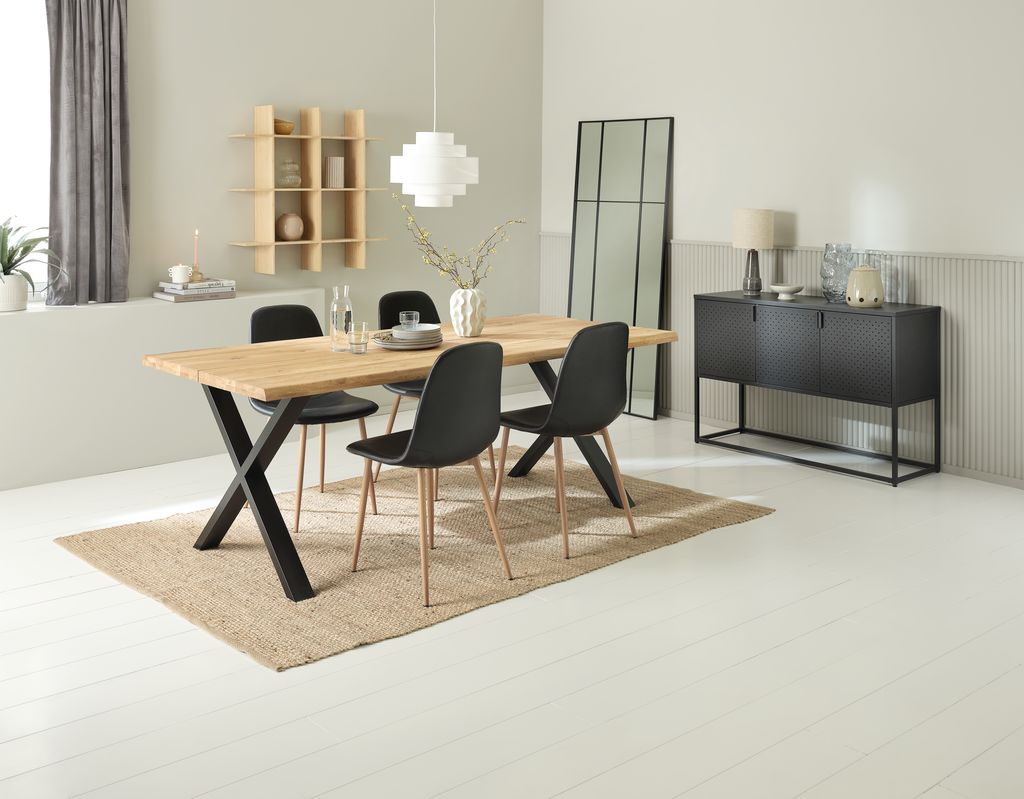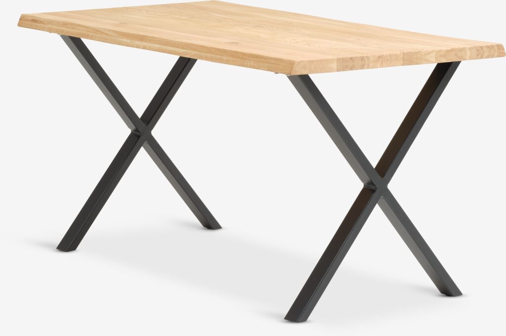 Masă extensibilă cu blat din lemn masiv de stejar și picioare negre din oțel. Lemnul este tratat cu ulei pentru protejarea și conservarea culorii naturale. Adăugând extensii se poate extinde până la 250 cm sau 300 cm pentru reuniuni mari. Extensiile pot fi cumpărate separat. 95x200x75 cm
