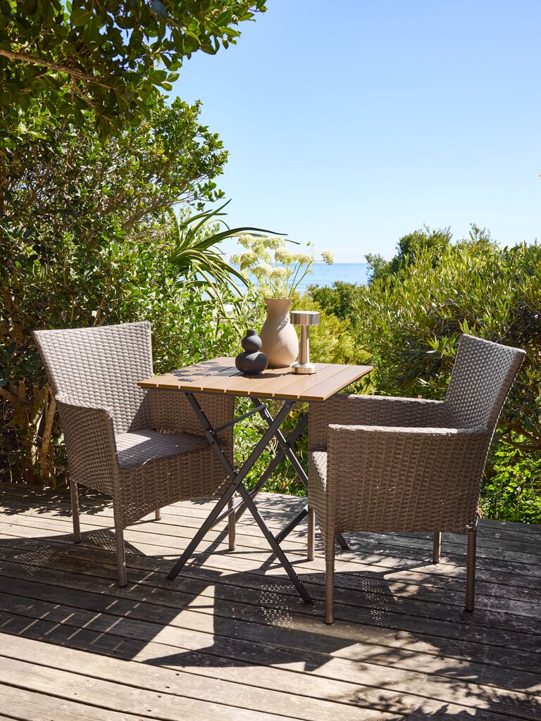 Set de terasă cu 2 locuri. Masă: Lemn de esență tare FSC®, tratat cu ulei. Pliabilă. 62x62x74 cm Scaun: Oțel și poliratan. Stivuibil.