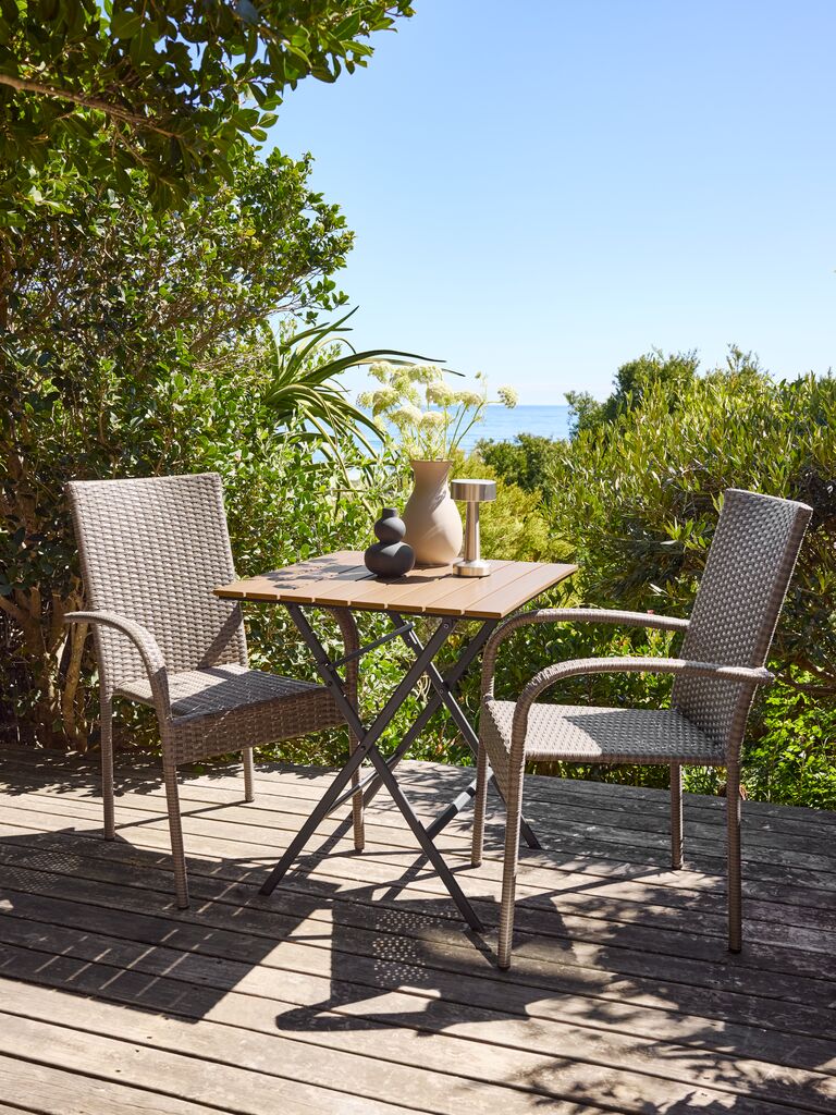 Set de terasă cu 2 locuri. Masă: Lemn de esență tare FSC®, tratat cu ulei. Pliabilă. 62x62x74 cm Scaun: Oțel și poliratan. Stivuibil.