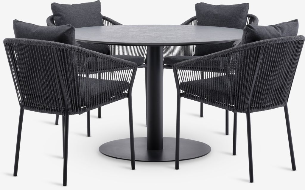Set de grădină cu 4 locuri. Masă: Oțel și ciment. Ø120x74 cm Scaun: Aluminiu și poliester. Incl. perne cu husă cu uscare rapidă, țesută. Stivuibil.