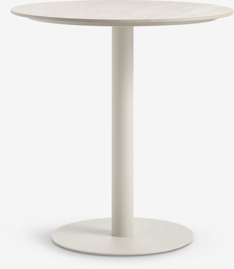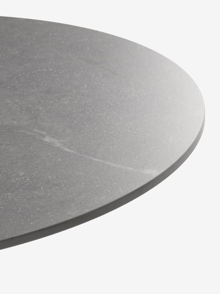 Oțel și piatră sinterizată. Blatul din piatră sinterizată este rezistent la zgârieturi, pete și temperaturi ridicate. Ø70 x 72 cm