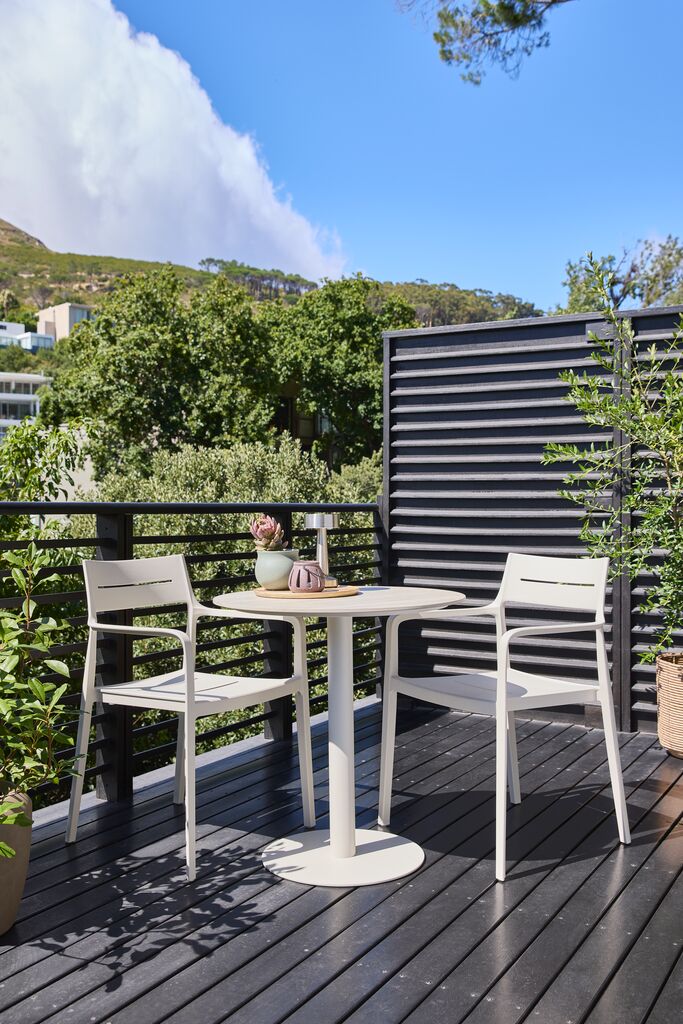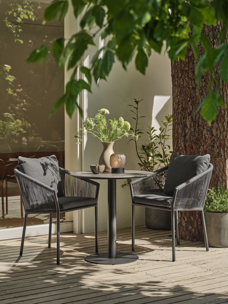 Masa de terasă gri cu blat din lemn artificial și baza din aluminiu vopsit. Lemnul artificial are aspectul și textura lemnului natural fără a necesita întreținere. Aluminiul este un material ușor și robust, care nu ruginește. 70x70x73 cm