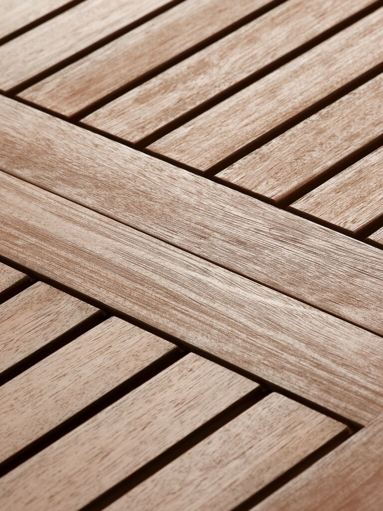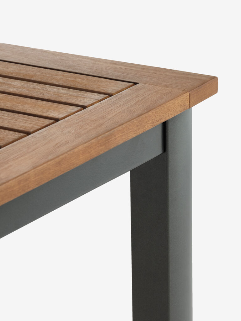 Set de grădină cu 4 locuri. Masă: Aluminiu și lemn de esență tare FSC®, tratat cu ulei. Incl. 1 extensie, care poate fi depozitată sub blat. 99x214/297x75 cm Scaun: Aluminiu, textilină și lemn de esență tare FSC®, tratat cu ulei. Stivuibil.