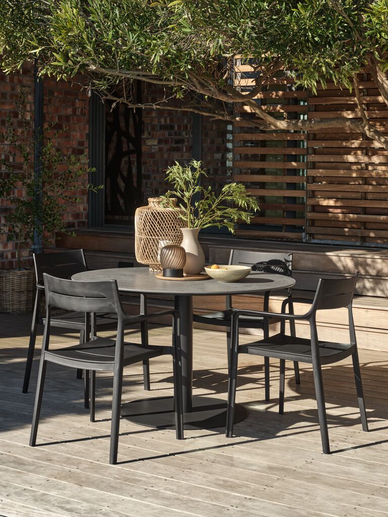 Set de mobilier de grădină cu 4 locuri. Masă: Oțel și ciment. Ø120x74 cm Scaun: Plastic cu protecție UV (20% reciclat). Stivuibil
