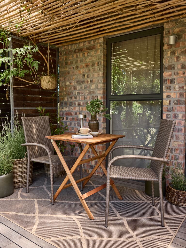 Set de terasă cu 2 locuri. Masă: Lemn de esență tare FSC®, tratat cu ulei. Pliabilă. 62x62x74 cm Scaun: Oțel și poliratan. Stivuibil.