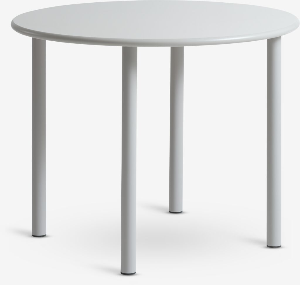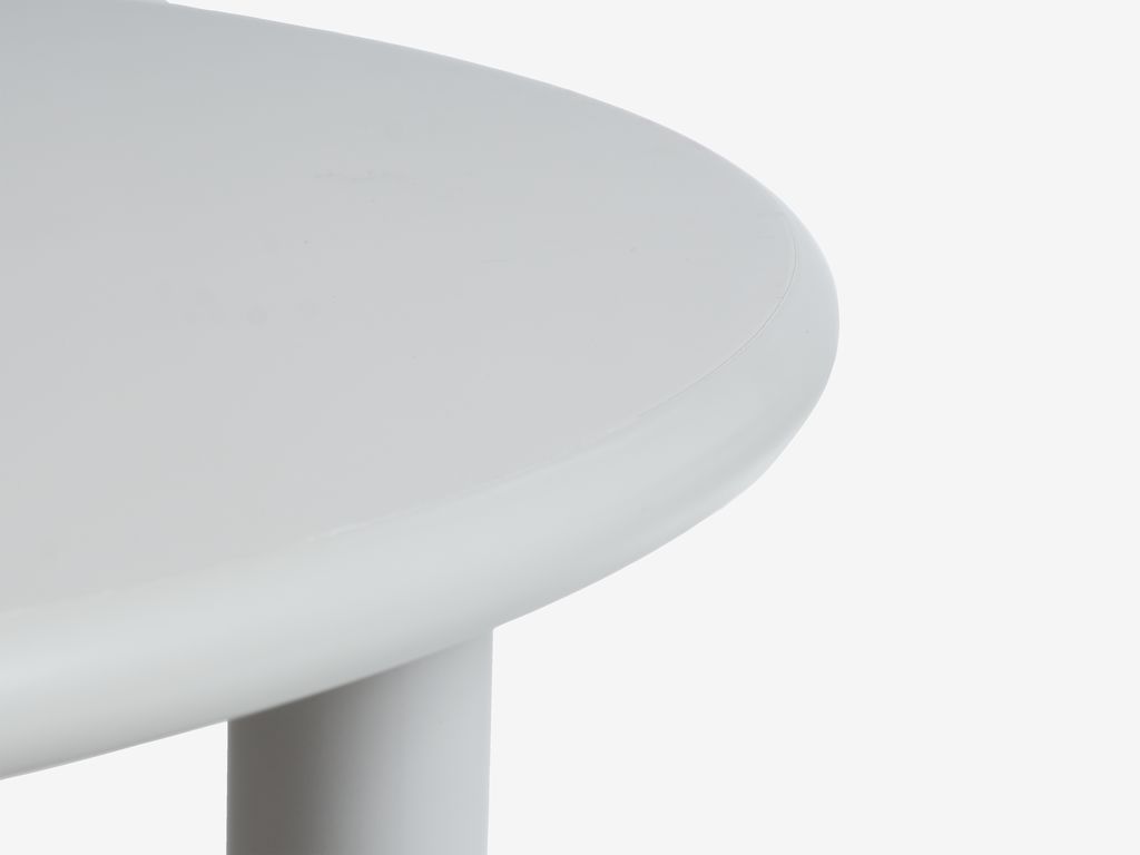 Masă rotundă realizată din panouri transparente cu plăci MDF și detalii suplimentare din oțel. Blatul are o margine rotunjită. 100 x 75 cm.