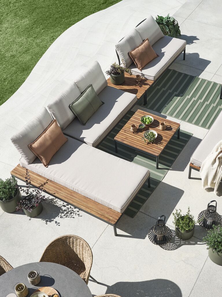 Modul șezlong pentru set de terasă modular. Aluminiu și lemn de esență tare FSC®, tratat cu ulei. Modul șezlong pentru set modular de terasă. Incl. perne cu husă rezistentă, țesută. Poate fi inversat. 93x72x181 cm