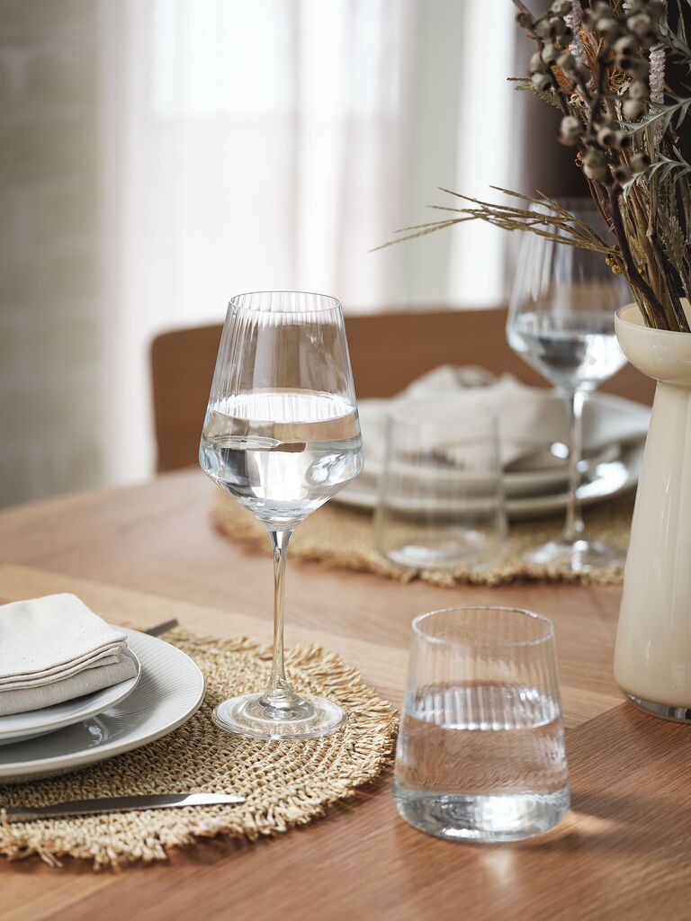 Pahar din sticlă transparentă, cu o formă modernă și un design simplu cu striații. Cu o capacitate generoasă de 42 cl, este potrivit pentru băuturile de zi cu zi și este, de asemenea, rezistent la mașina de spălat vase. Pachet de 2. Ø9 x H10 cm