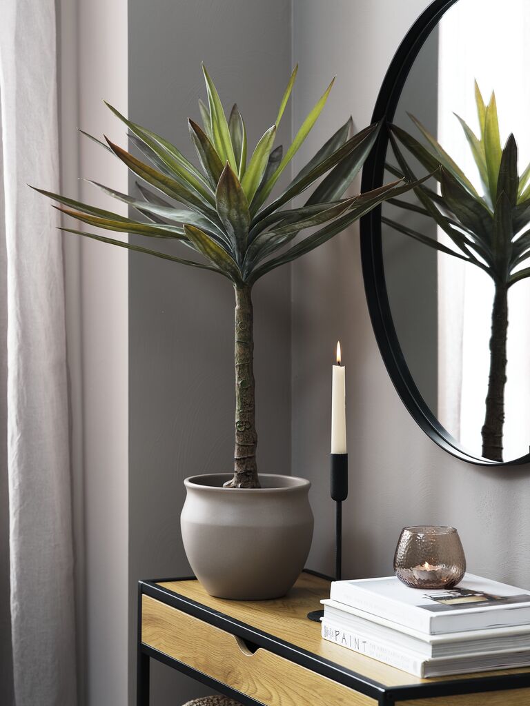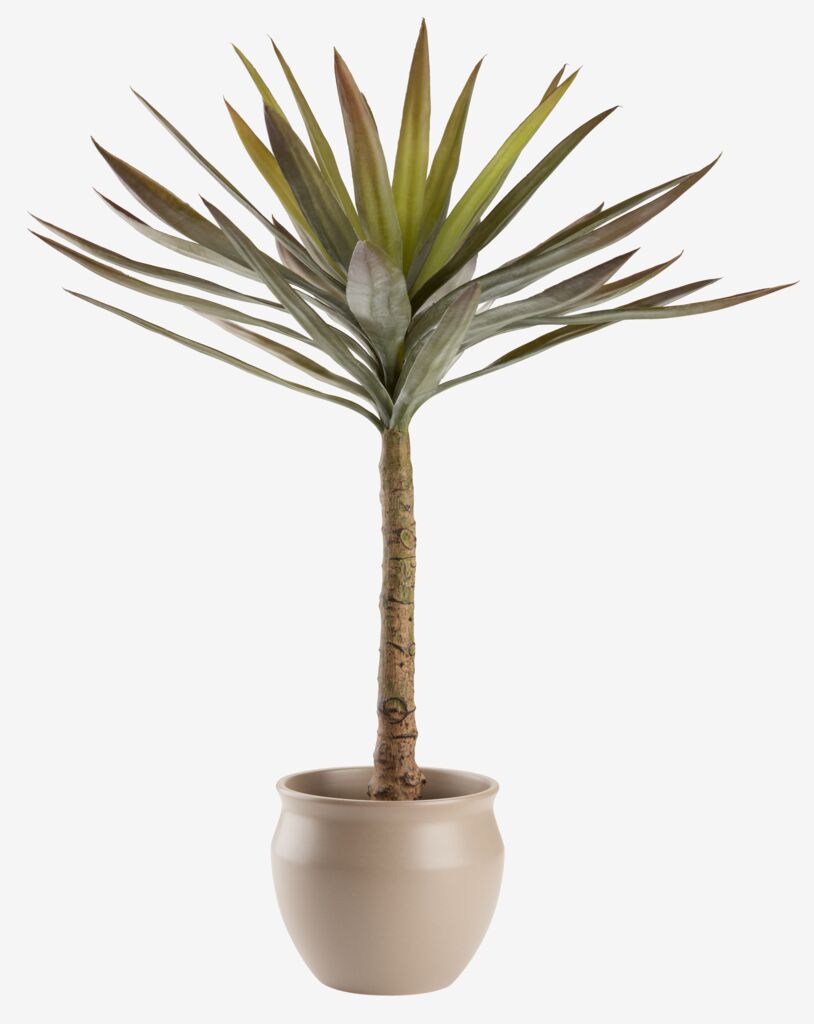 Plantă artificială cu frunze lungi și verzi și tulpină înaltă, plasată într-un ghiveci negru. Dimensiunea plantei o face potrivită ca plantă de podea, fie acasă, fie la birou. Ø60x75 cm