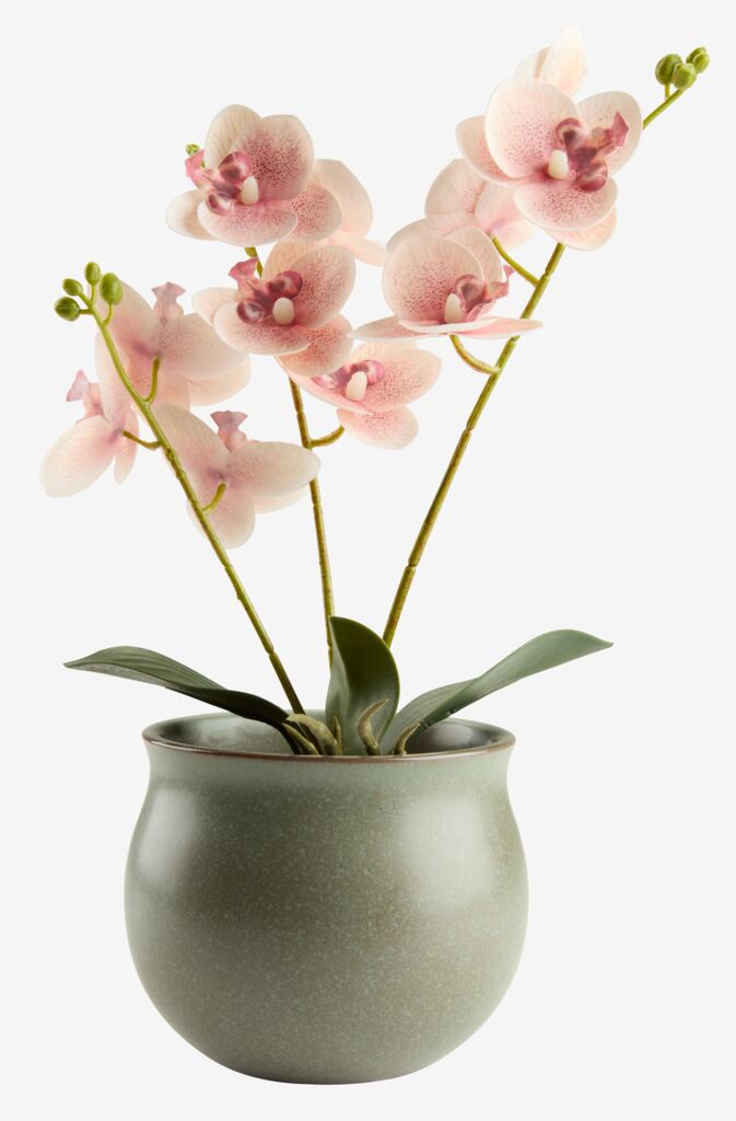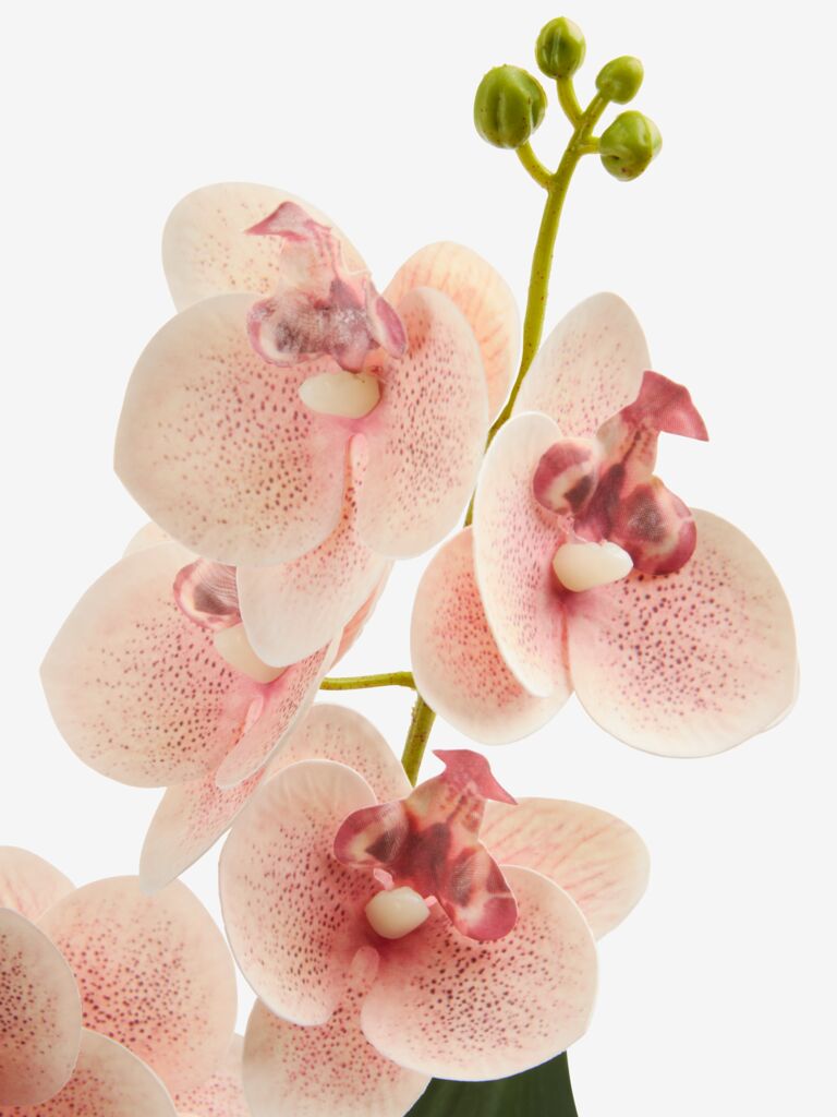 Planta artificială cu orhidee roz realiste într-un ghiveci elegant negru. Ideală pentru birouri sau rafturi. Ø9x35 cm