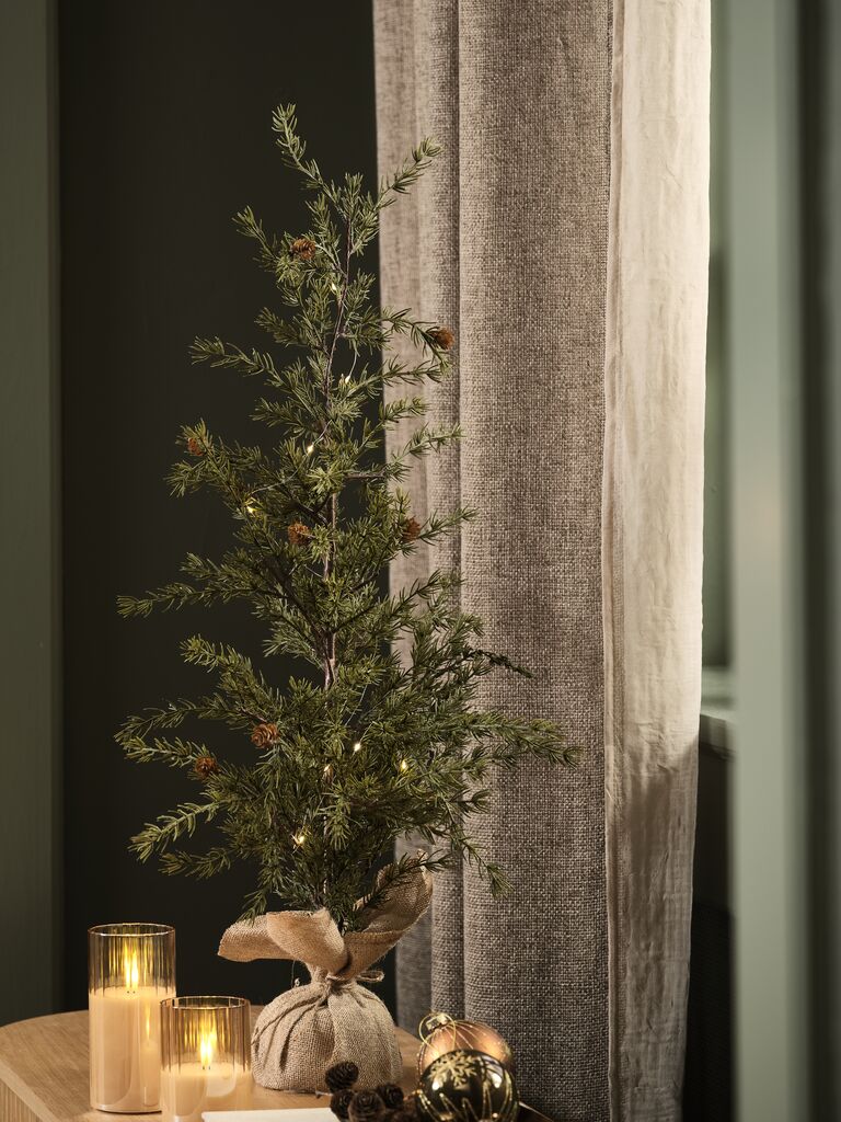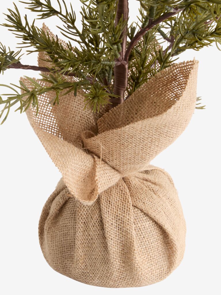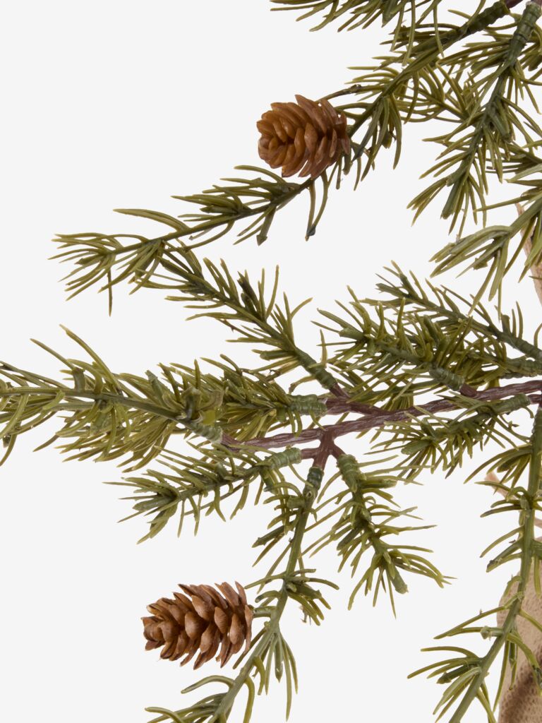 Pom artificial cu conuri, prezentat într-un ghiveci simplu cu o husă de iută. Ideal dacă vă place să adăugați elemente din natură atmosferei de Crăciun din casă. Decorați-l cu decorațiunile preferate pentru pomul de Crăciun. 35x35x90 cm