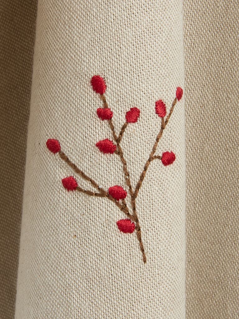 Prosop de bucătărie din bumbac 100% cu o broderie delicată de crenguțe cu bobițe roșii pe un fundal bej. O modalitate simplă de a aduce un aspect clasic de Crăciun în bucătărie. Set de 2 bucăți. 50x70 cm
