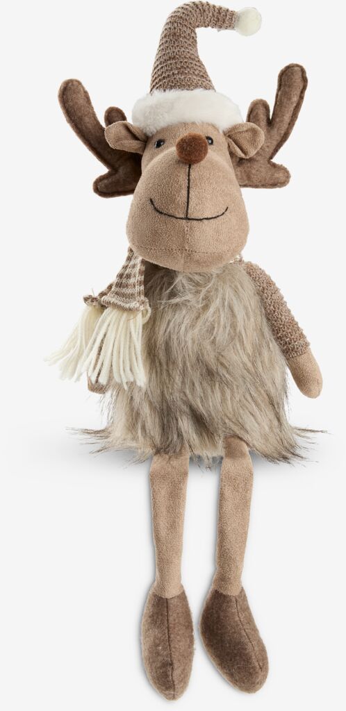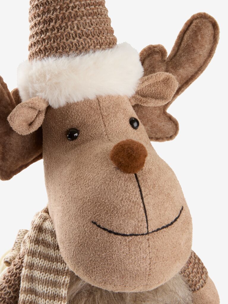 Ren drăgălaș în culorile maro și bej, cu fular și căciulă de Moș Crăciun. Conceput pentru a sta așezat cu picioarele atârnând peste un raft. Un element drăguț pentru decorațiunile de Crăciun de acasă. l18-23 x L14 x H40-60 cm
