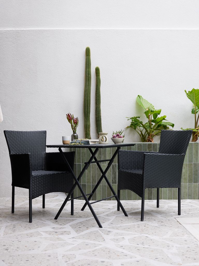 Set de terasă cu 2 locuri. Masă: Lemn de esență tare FSC®, tratat cu ulei. Pliabilă. 62x62x74 cm Scaun: Oțel și poliratan. Stivuibil.