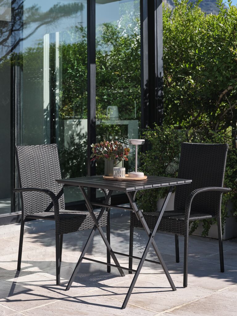 Set de terasă cu 2 locuri. Masă: Lemn de esență tare FSC®, tratat cu ulei. Pliabilă. 62x62x74 cm Scaun: Oțel și poliratan. Stivuibil.