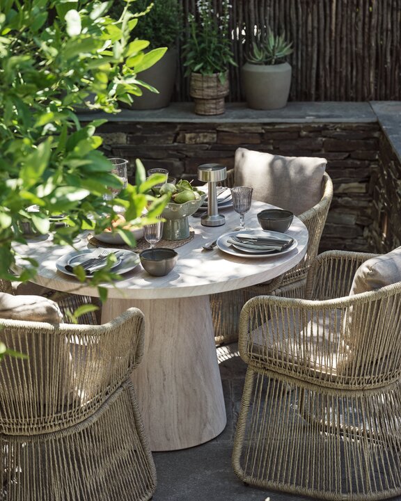 Scaun de grădină cu șezut din poliratan și cadru alb din aluminiu vopsit cu pulbere. Poliratanul oferă un aspect natural de răchită, fiind în același timp rezistent la intemperii și nu necesită întreținere. Aluminiul este un material ușor și robust, care nu ruginește.