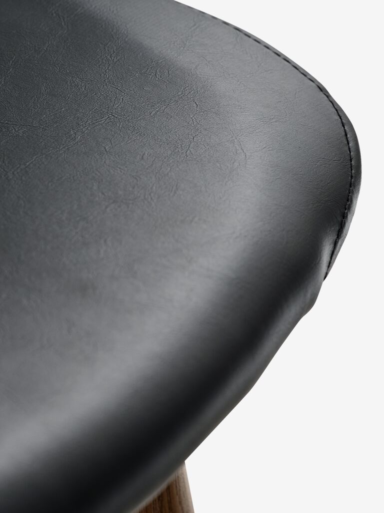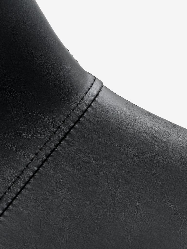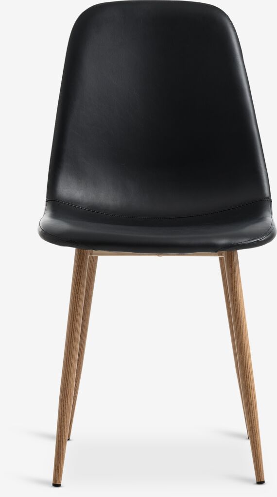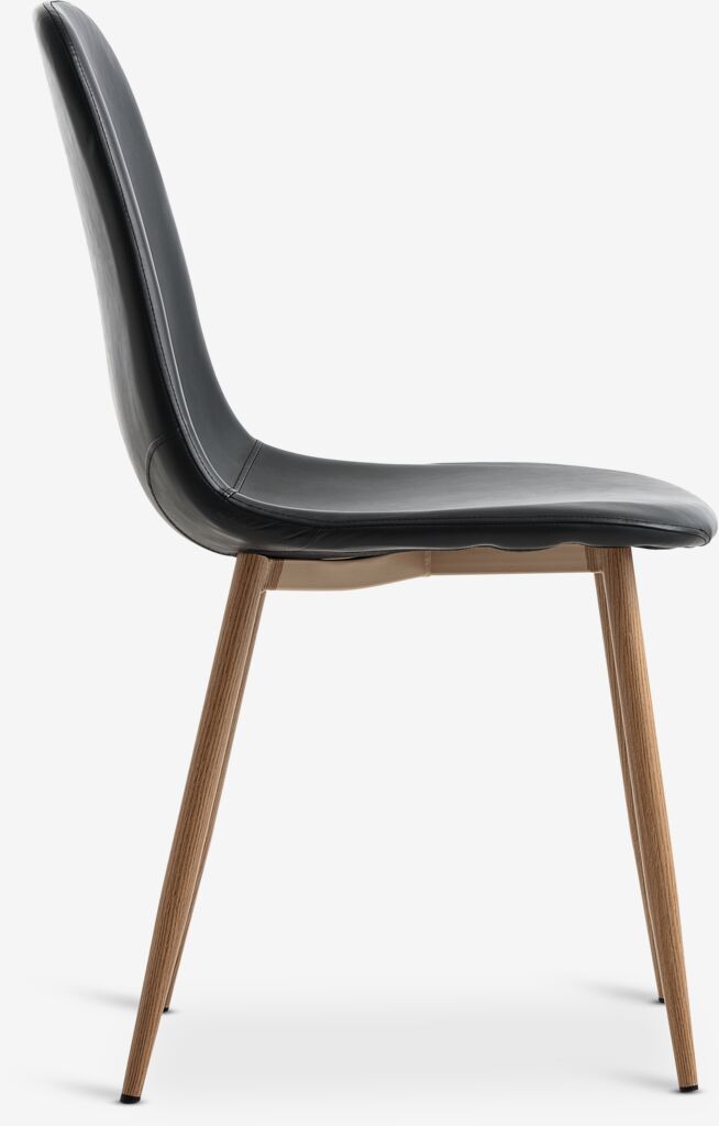 Scaun de dining cu șezut căptușit și spătar din imitație de piele neagră. Picioare de culoare stejar din oțel.