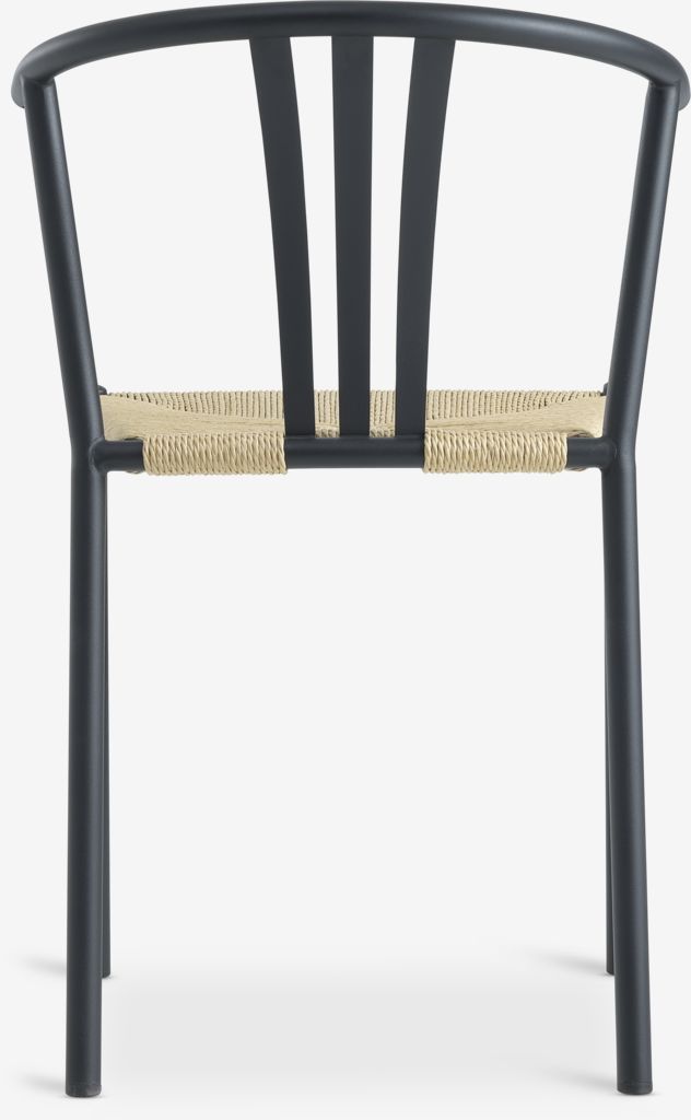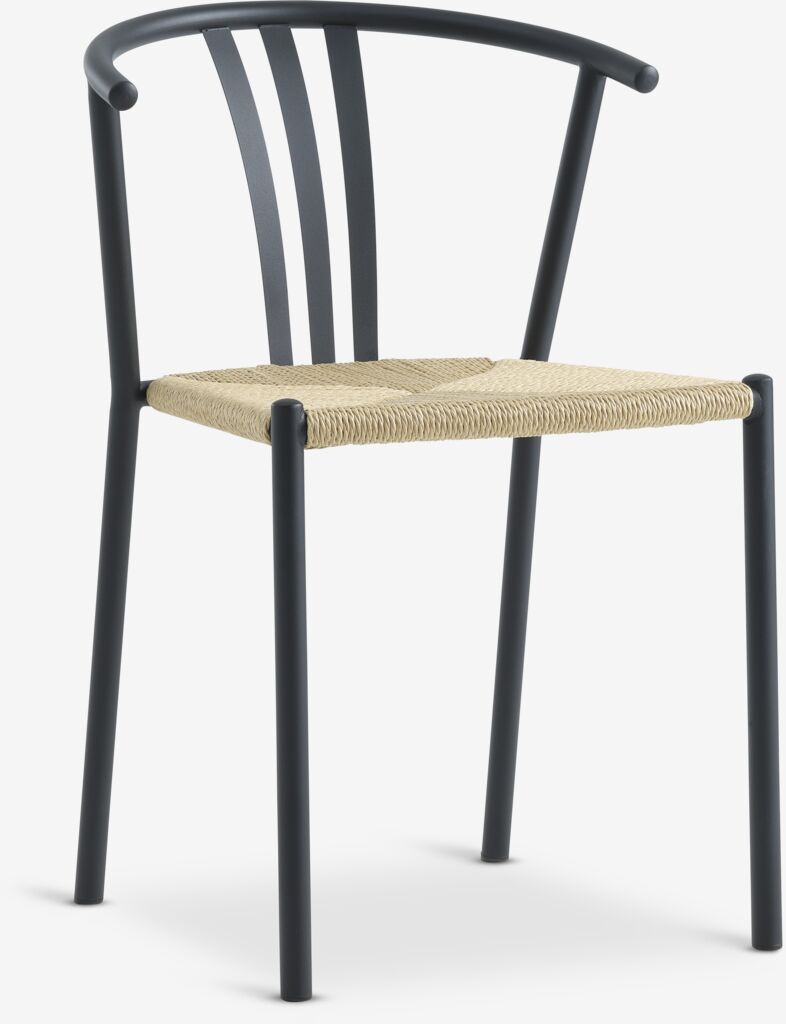 Scaun de dining cu șezut din fire de hârtie împletite și structură neagră din oțel.