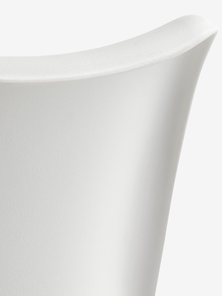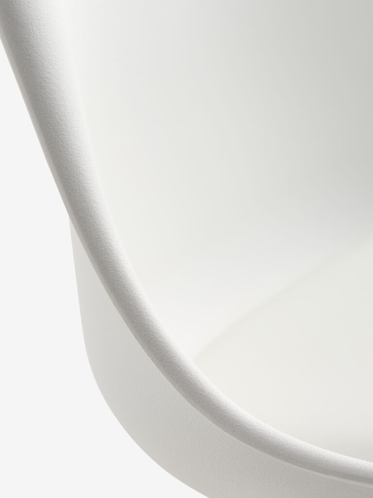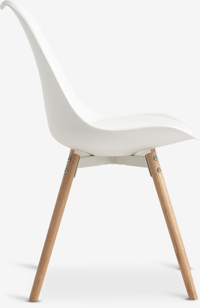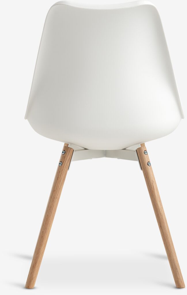 Scaun de dining cu șezut turnat și pernă fixă din imitație de piele albă. Picioare din lemn masiv de stejar. Lemnul este lăcuit pentru durabilitate extinsă.
