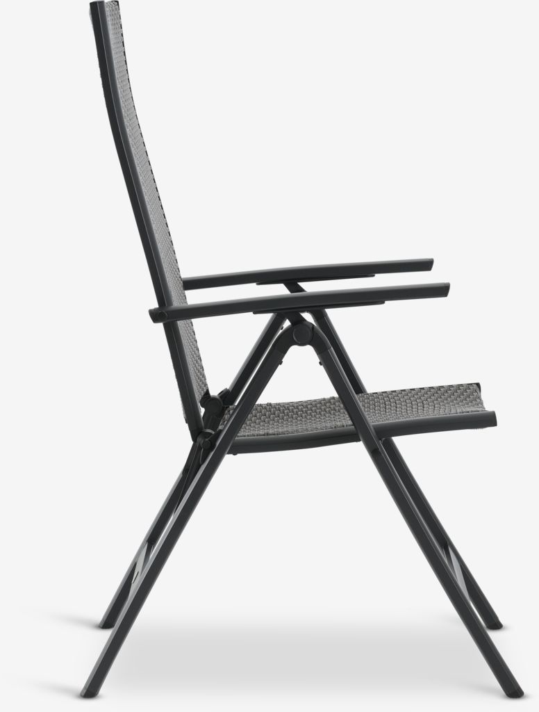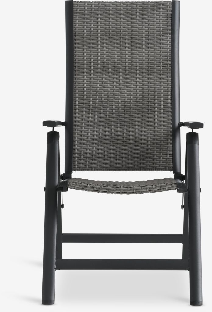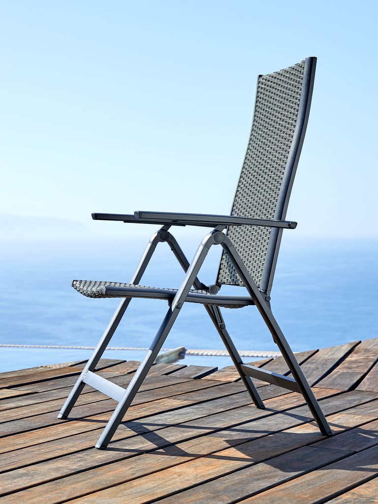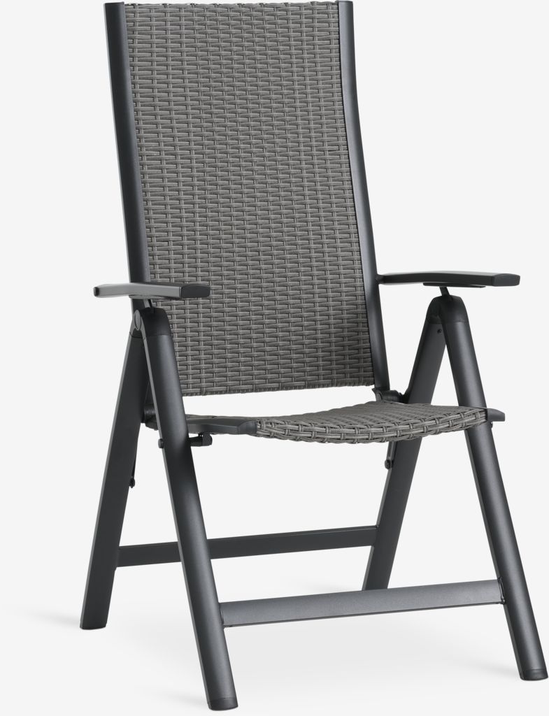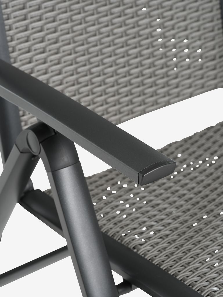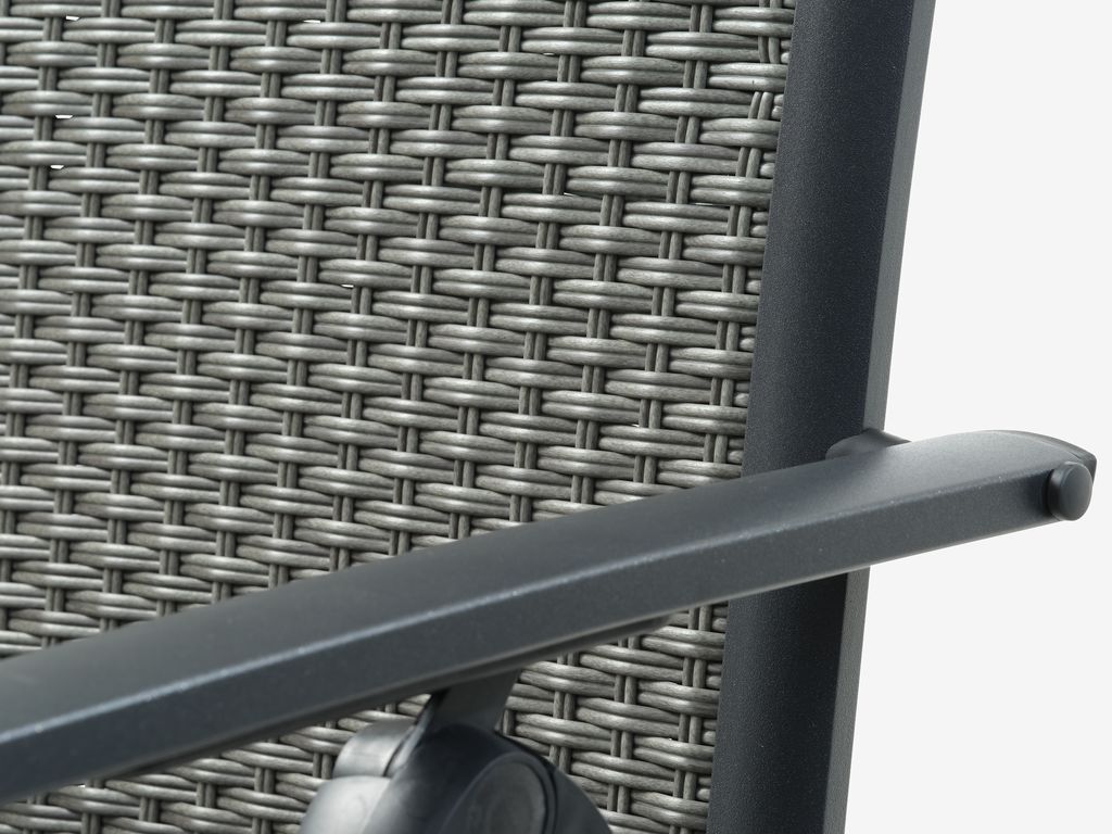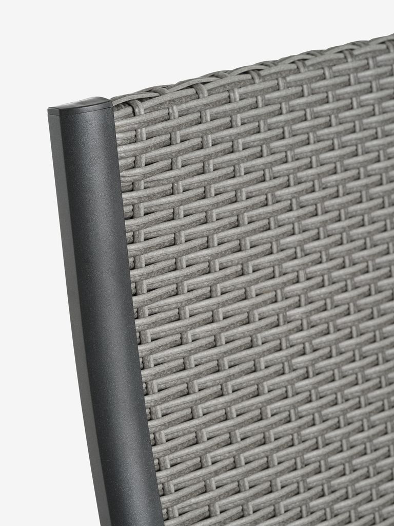 Scaun reglabil gri cu șezut și spătar din poliratan și cadru din aluminiu vopsit cu pulbere. Spătarul poate fi înclinat în 6 poziții. Poliratanul oferă un aspect natural de răchită, fiind în același timp rezistent la intemperii și fără întreținere. Aluminiul este un material ușor și robust, care nu ruginește. Scaunul de grădină poate fi pliat, ceea ce îl face ușor de transportat și depozitat.