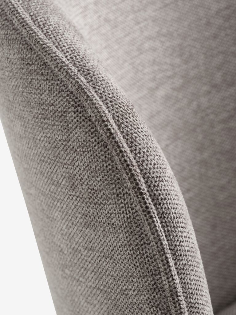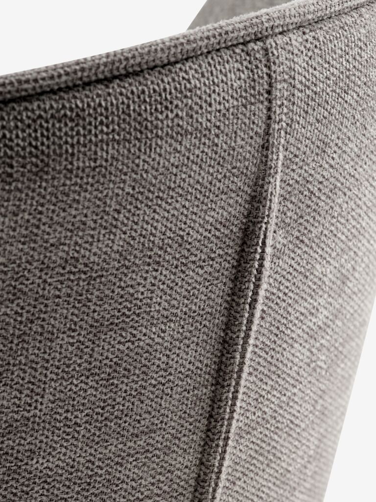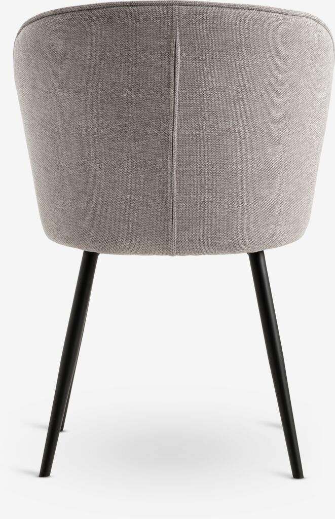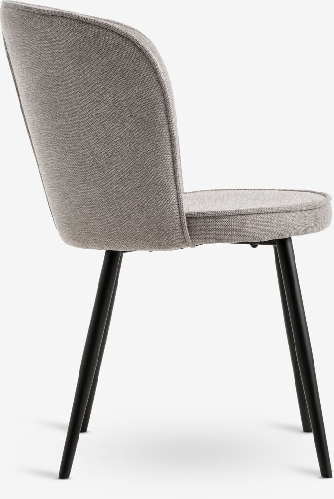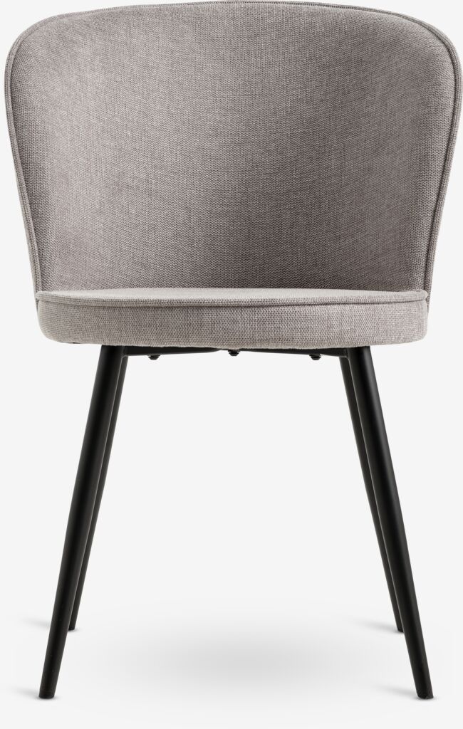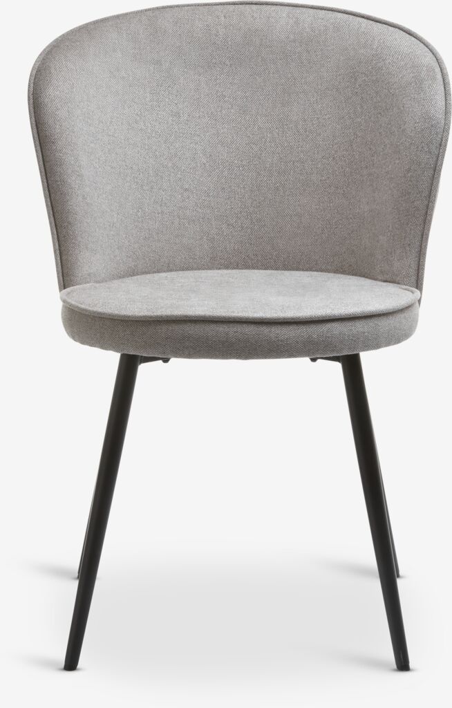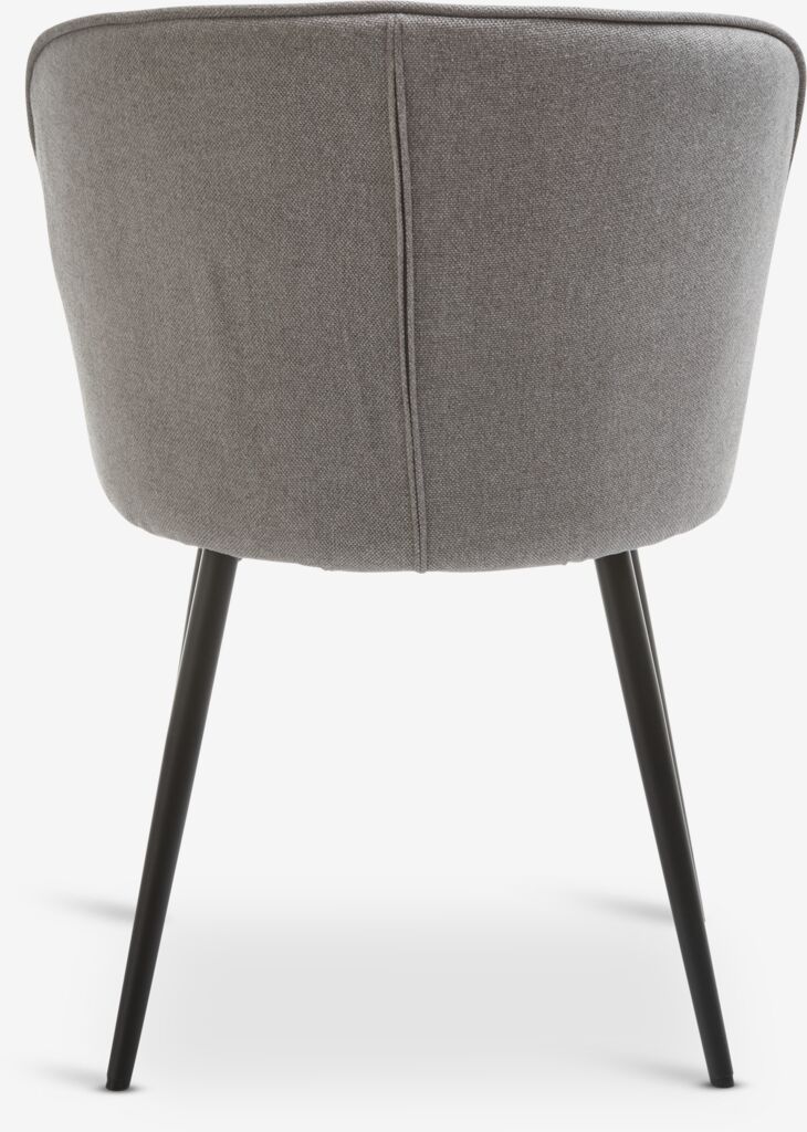 Scaun de dining cu șezut căptușit și spătar din material textil gri. Picioare negre din oțel.