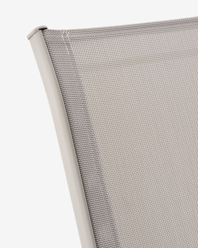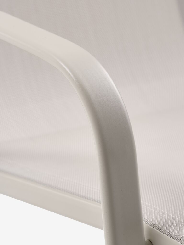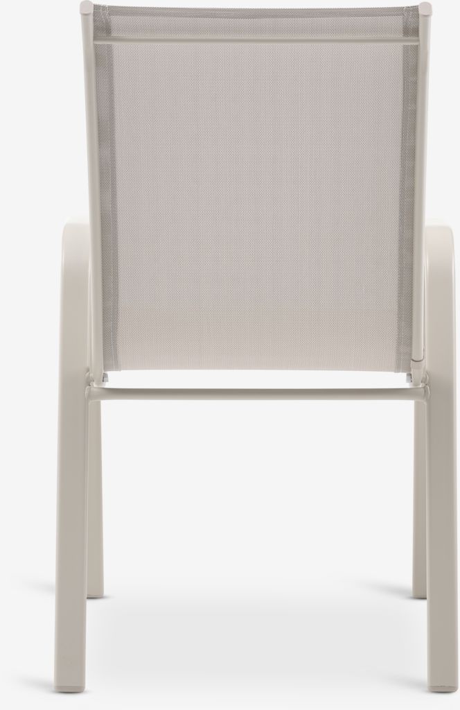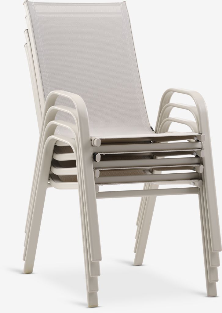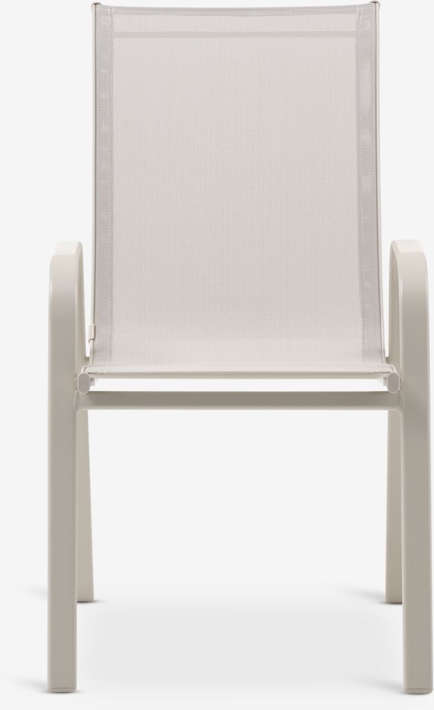 Scaun stivuibil bej din textilină și cadru din otel vopsit cu pulbere. Textilina este un material confortabil, rezistent la decolorare, care se usucă rapid și este ușor de curățat. Scaunul de grădină poate fi stivuit pentru o depozitare compactă.