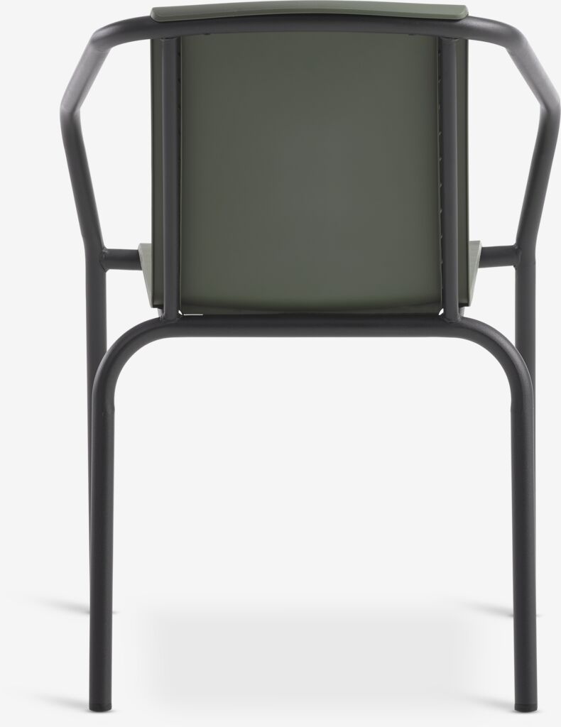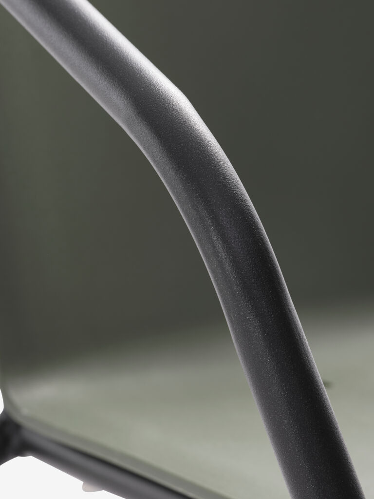 Scaun stivuibil negru cu șezut și spătar din textilină și cadru din oțel vopsit cu pulbere. Textilina este un material confortabil, rezistent la decolorare, care se usucă rapid și este ușor de curățat. Scaunul de grădină poate fi stivuit pentru depozitare compactă.