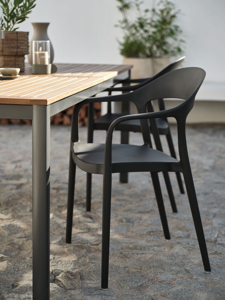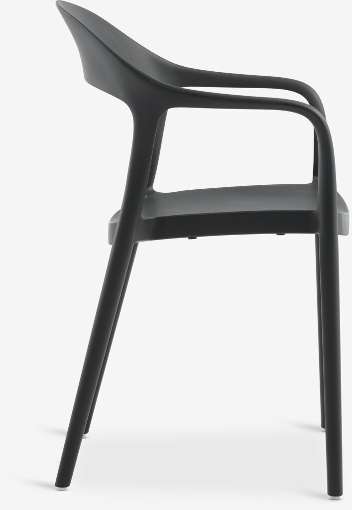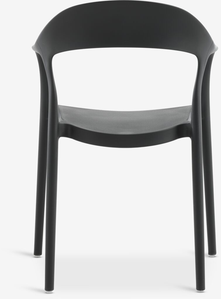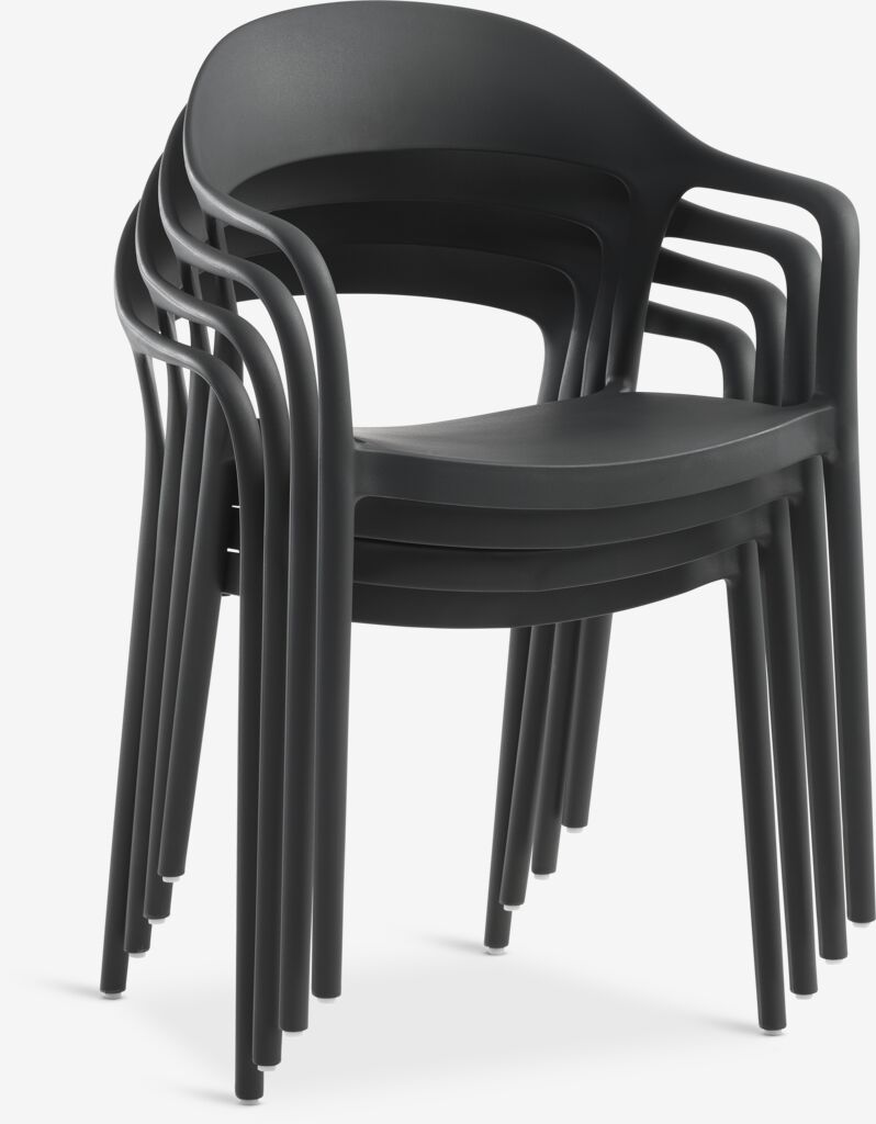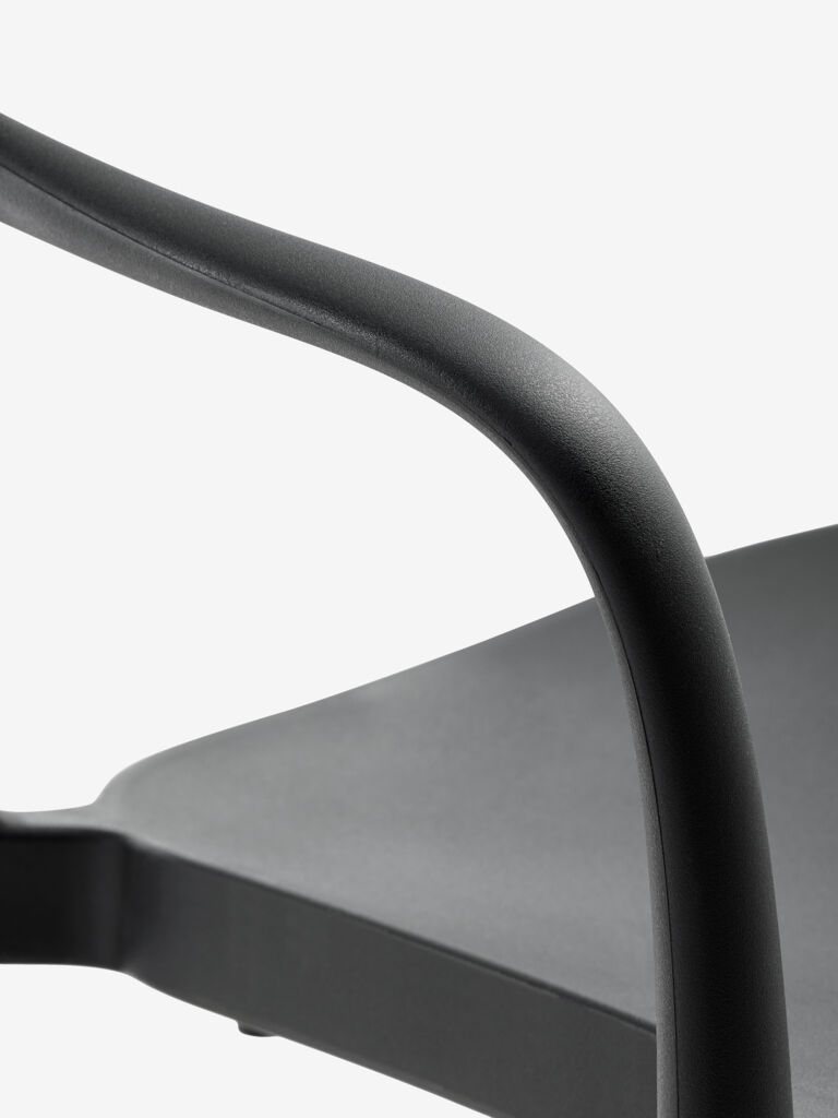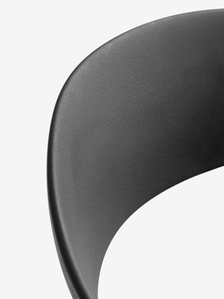 Scaun negru stivuibil din plastic (20% reciclat), cu protecție împotriva UV pentru a preveni decolorarea. Scaunul de grădină poate fi stivuit pentru depozitare compactă.