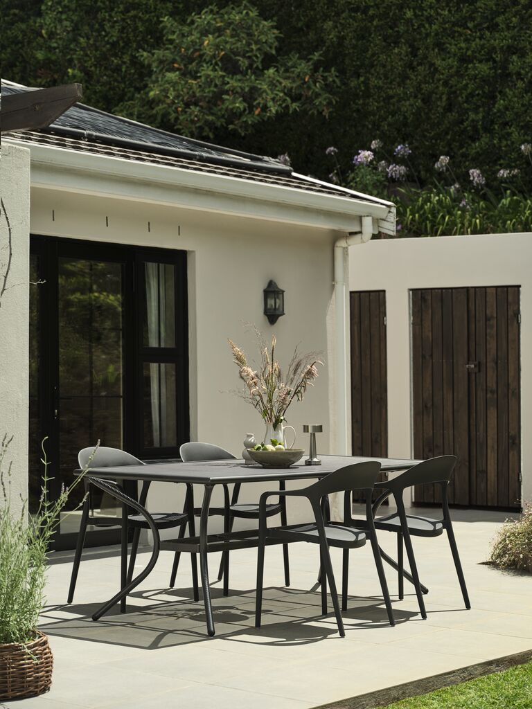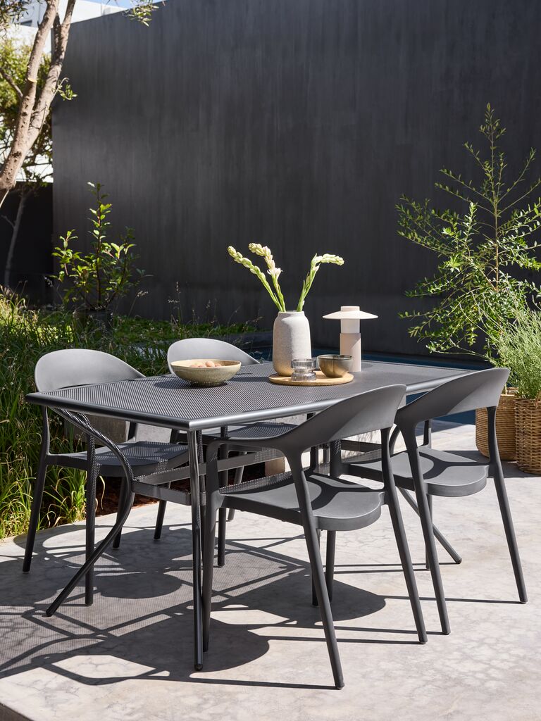 Scaun stivuibil negru cu șezut și spătar din plastic și cadru din aluminiu vopsit cu pulbere. Plasticul este protejat împotriva UV pentru a preveni estomparea culorii. Aluminiul este un material ușor și robust, care nu ruginește. Scaunul de grădină poate fi stivuit pentru depozitare compactă.