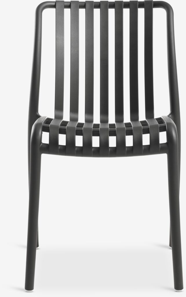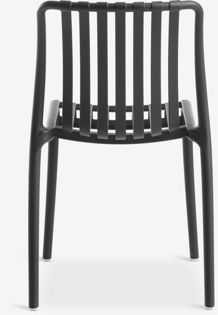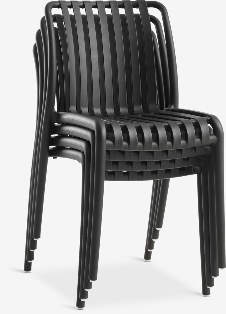 Scaun negru stivuibil din plastic (20% reciclat), cu protecție împotriva UV pentru a preveni decolorarea. Scaunul de grădină poate fi stivuit pentru depozitare compactă.