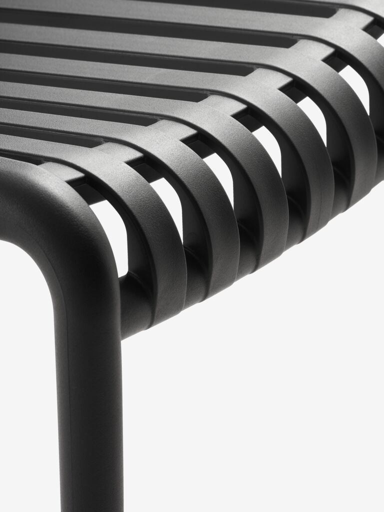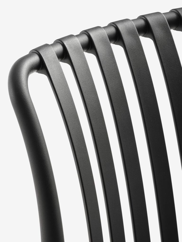 Scaun de grădină negru cu șezut turnat din plastic (100% reciclat),cu protecție UV pentru a preveni estomparea culorii. Picioare asortate din oțel vopsit cu pulbere.