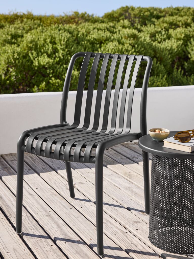 Scaun stivuibil negru cu șezut și spătar din plastic și cadru din aluminiu vopsit cu pulbere. Plasticul este protejat împotriva UV pentru a preveni estomparea culorii. Aluminiul este un material ușor și robust, care nu ruginește. Scaunul de grădină poate fi stivuit pentru depozitare compactă.