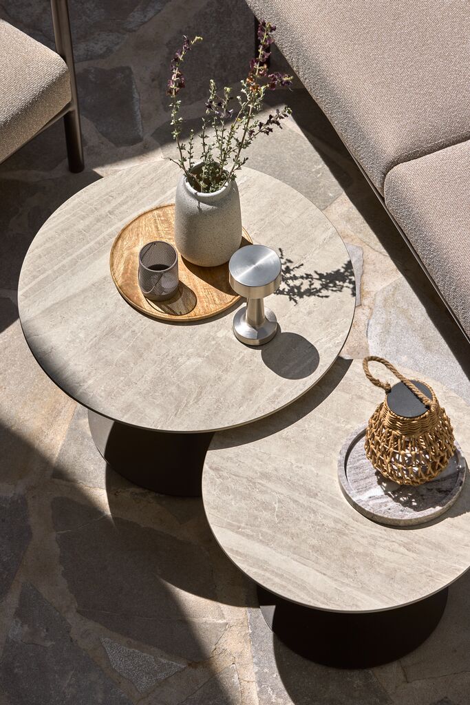 Set de terasă cu 6 locuri. Masă: Oțel, lemn artificial și poliratan. 74x145x67 cm. Colțar 6 locuri: Oțel și poliratan. Nu poate fi inversat. Incl. perne luxoase cu husă rezistentă, țesută.