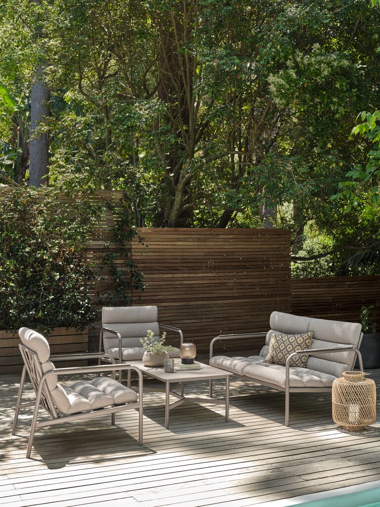 Set de terasă cu 4 locuri. Masă: Oțel, lemn de esență tare FSC®, tratat cu ulei și poliratan. 56x93x43 cm. Canapea cu 2 locuri și fotolii: Oțel și poliratan. Incl. perne luxoase cu husă rezistentă, țesută.