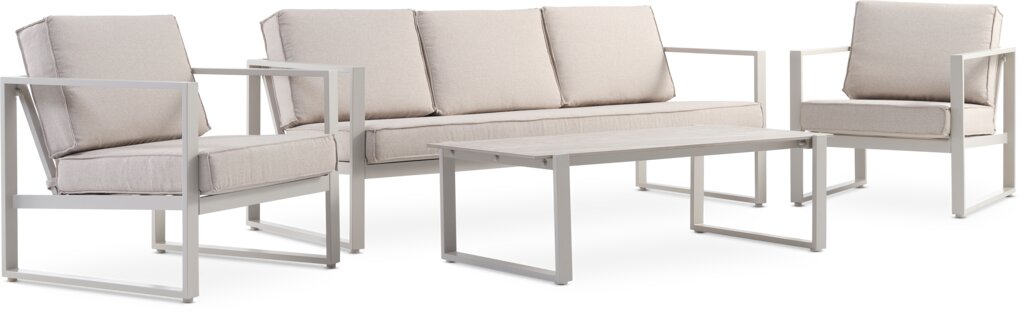 Set de terasă cu 4 locuri. Masă: Oțel, lemn de esență tare FSC®, tratat cu ulei și poliratan. 56x93x43 cm. Canapea cu 2 locuri și fotolii: Oțel și poliratan. Incl. perne luxoase cu husă rezistentă, țesută.