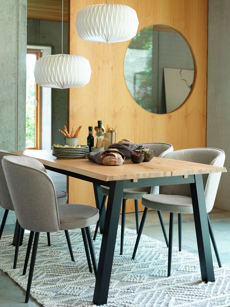 Masă: Lemn masiv de stejar și furnir de stejar. Excl. extensii. 90x160x76 cm Scaun: Material textil și oțel.