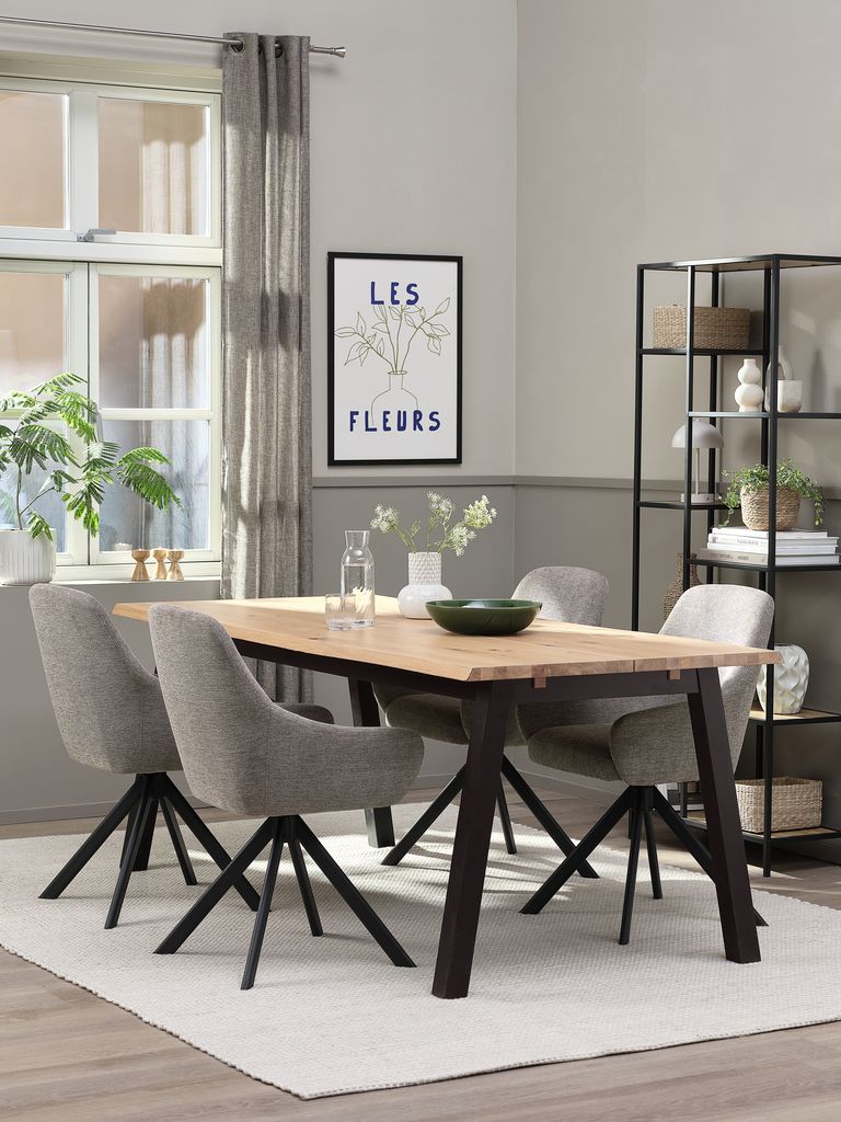Masă: Lemn masiv de stejar și furnir de stejar. Excl. extensii. 90x160x76 cm Scaun: Material textil. Cu bază rotativă din oțel.