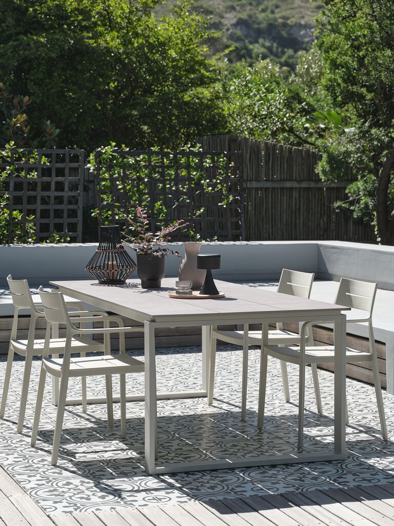 Set de grădină cu 4 locuri. Masă: Aluminiu și lemn artificial. 90x150x74 cm Scaun: Plastic cu protecție UV (20% reciclat). Stivuibil