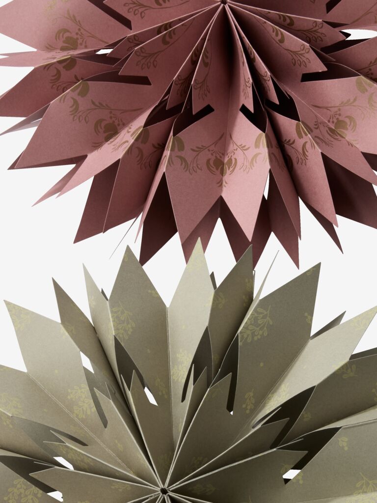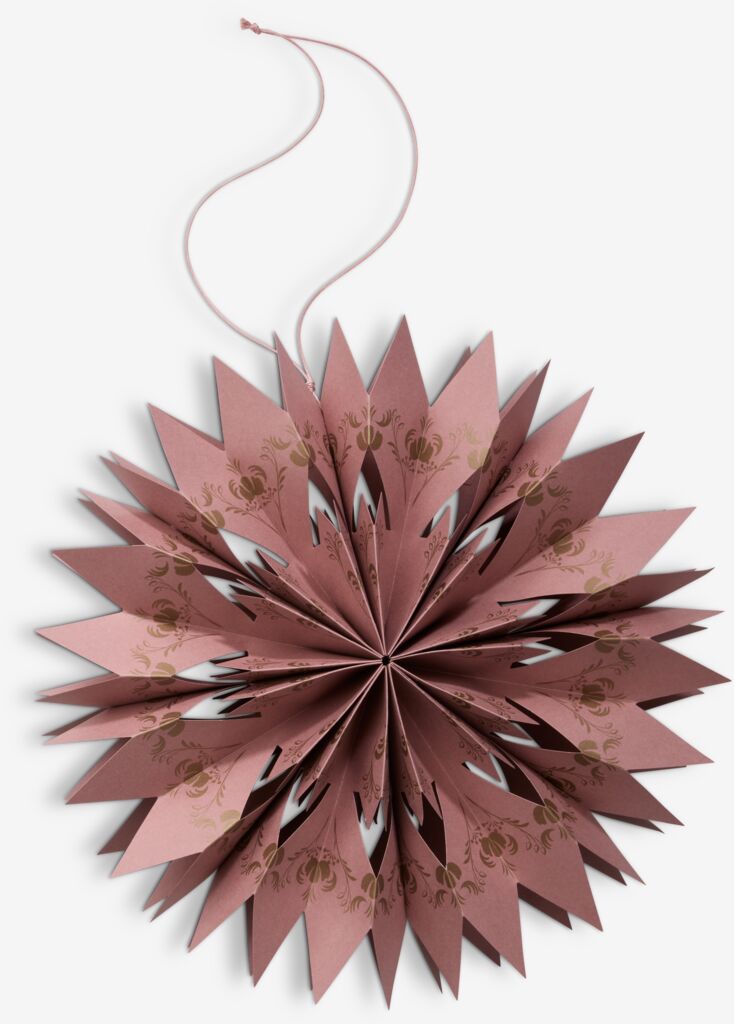 Stea de Crăciun confecționată din hârtie reciclată FSC®, concepută pentru a fi agățată în fereastră sau de tavan. Adaugă o atmosferă tradițională și primitoare oricărei încăperi. Disponibilă în verde șters sau roz prăfuit. Ø30 x ad7 cm