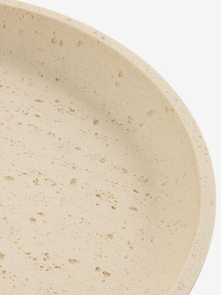 Tavă decorativă realizată din polirășină, cu un finisaj bej cu textură de nisip. Ideală pentru organizarea obiectelor sau ca element decorativ pe masa de cină. Ø30x3 cm
